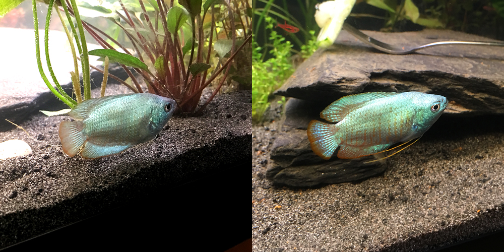 Kääpiörihmakalan väritys, 7 päivää sitten vs. tänään. Oranssia alkaa näkyä ihan kunnolla hännässä ja raidatkin tulleet esille :) Kyseessähän on toki neon blue -värimuunnos, mutta minusta tosi kivan näköiset nuo "jäänteet" kääpiörihmakalan normivärityksestä, jotka nyt sinisen alta puskevat esiin.