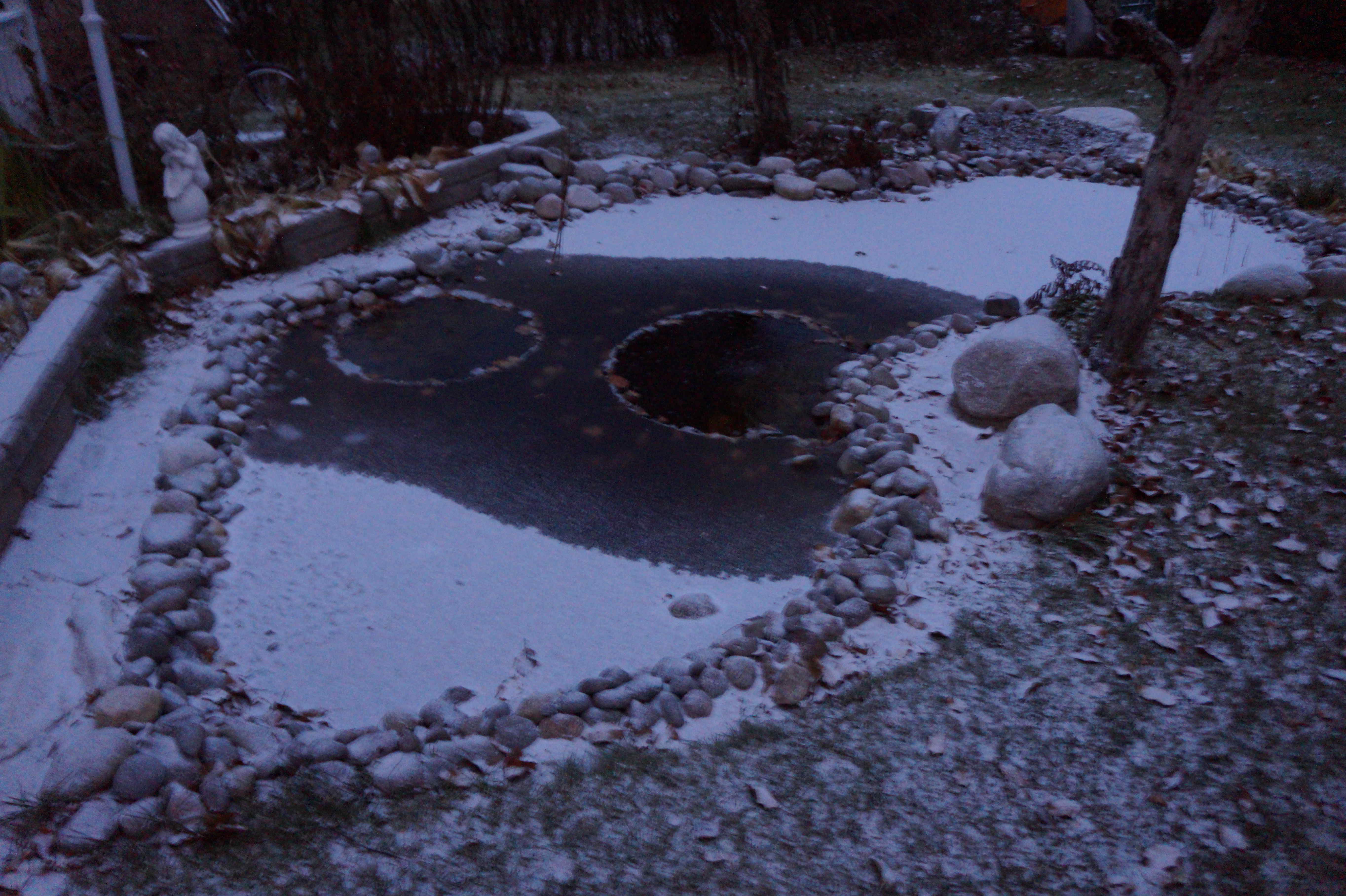Ensimmäinen kesä takana, kaikki toimi kuin junan vessa... Viime viikon lauantaina poistin suodattimen ja skimmerin altaasta ja tänä aamuna jäätä oli mitatessa 6,5 cm. Ainakin toistaiseksi näyttää ilmastus pitävän jään auki moitteetta, suurempi avanto on noin metrin halkaisialtaan. Kesän aikana yksi karpeista muutti väriään valkoisesta ensin harmaaksi, sitten mustaksi ja jäi nyt syksyllä sitten violetiksi?? Melkoinen mutaatio kaveri