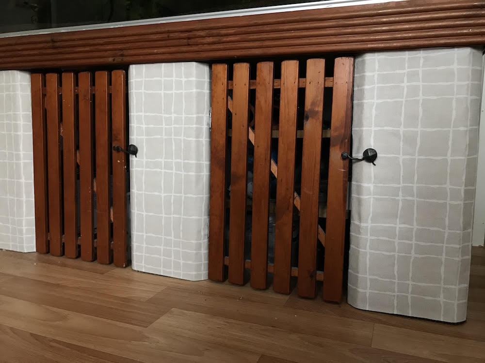 Meikäläisen viritys jalustan verhoilusta. Levyt ovat mittoihin teetettyjä 3mm paksua HDF levyä. Samaa, jota käytetään hyllyjen ja kaappien taustoihin. Ne on kiinnitetty kaksipuoliteipillä alumiiniseen kulmalistaan, jotka ovat puolestaan teipillä kiinni jalustassa. Liukuovet kulkevat muovisissa urakiskoissa. Näin ollen yhtään ruuvin reikää ym. ei ole tarvinnut tehdä itse jalustaan. Sisällä on mäntyinen liimalevy hyllynä tarvikkeille ja ulkosuodatin takana seinän ja jalustan välissä.