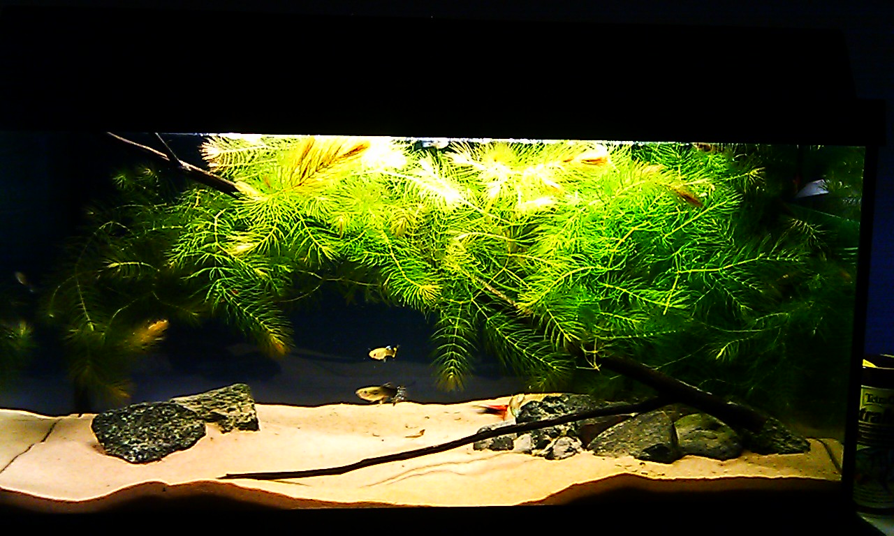 54litraisessa muuten on vedet ja lisäsin sinne aikuisia milliksiä, johan sinne oli poikasiakin tehtailtu. Kasviksi pistin pätkän karvalehteä suodattimen eteen, muuten on kasviton. Tuo karvalehti on nyt viikossa vallannut yli puolet altaasta, eli se on ainakin nelikertaistanut massansa