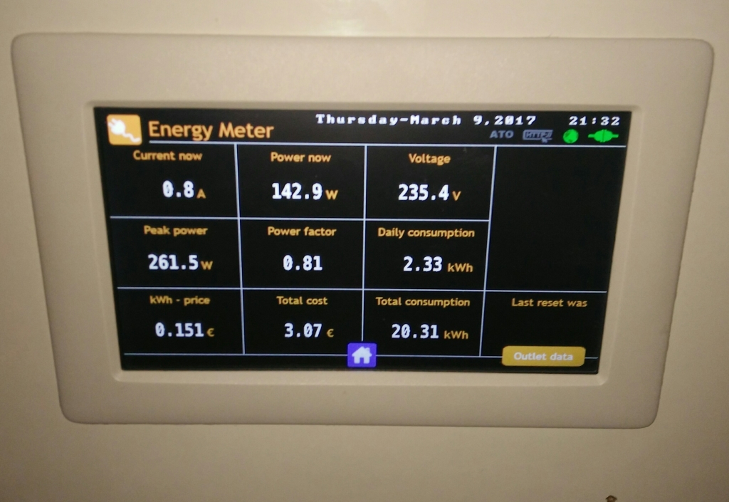 Tuossa kuva uuden toiminnon "päänäkymästä". Kuvan olen ottanut 9.3.2017 joten se näyttää maaliskuun sen astisen kulutuksen sekä hinnan euroina. Eli resetoituu kuukausittain. En ole vielä jaksanut viimeistellä tuota, joten esim tuo "last reset..." kohta ei vielä näytä mitään. Tuokin olisi muutaman rivin lisäys koodiin, mutta kun on muka aina niin kiire ettei jaksa / ehdi