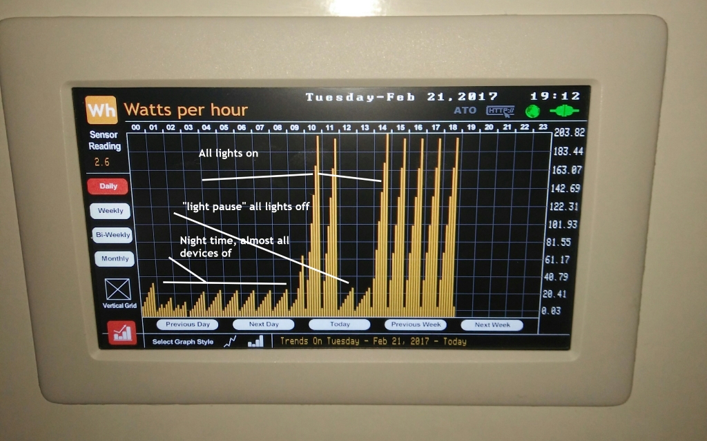 Tässä pikaisesti miltä esim tuo "watts per hour" näkymä näyttää. Se siis piirtää graafille kulutuksen watteina. Ja lukema resetoituu joka tunti. Ja koska graafisysteemi on rakennettu miten on, tallentaa se nuo arvot 7 kertaa tunnissa, eli viimeinen viiva on korkein, ja sen jälkeen resetoituu ja alkaa alusta. Kokeilin myös tapaa, jolloin graafi piirtää vain sen yhden viivan tunnissa, mutta se näyttää hieman tyhmältä, koska jäisi kauheat välit. Muutoksen tekeminen vaatisi niin isoa muutosta koko graafitoimintoon, että ei ole sen arvoista. Lisäksi kaikki arvot menevät palvelimelleni mysql tietokantaan, joten voin piirtää käppyrät vaikka kotisivuilleni niin halutessani.