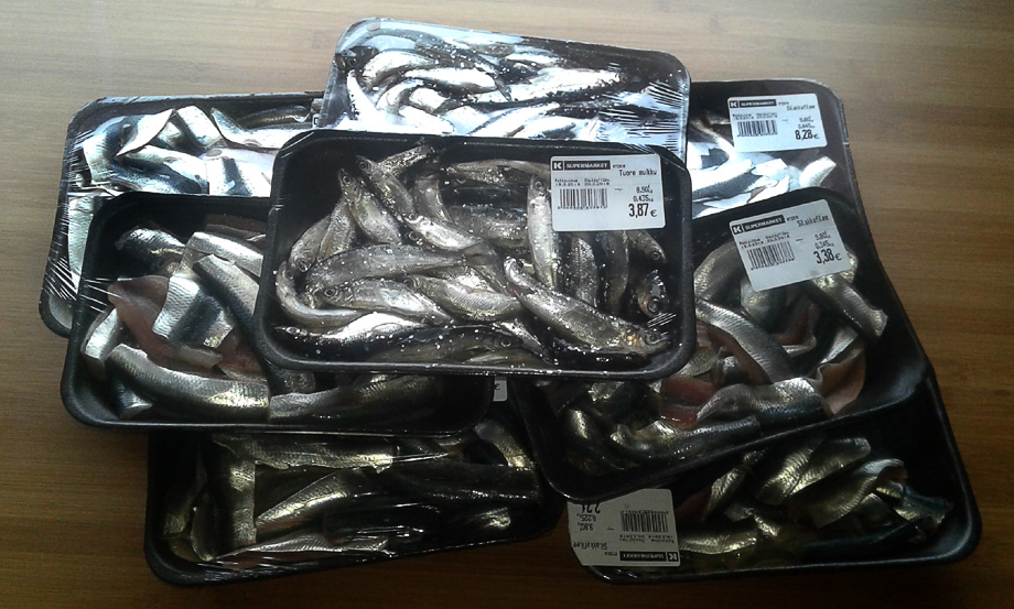 Kalat kasvavat hyvää vauhtia ja ruokahalu sen mukainen. Hain vähän täydennystä lähikaupasta. 3,5kg silakkafileitä ja kilon verran pieniä muikkuja... riittänee vähäksi aikaa taas. Eilen ruokin pelkästään broilerin rintafileillä kun muu ruoka oli pakkasesta loppunut ja kolme filettä meni heittämällä...