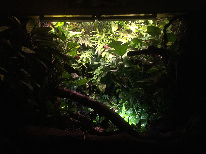 Pari viikkoa sitten raivasin viidakkoon valoaukon poistamalla "mikäliesaniaisen" lähes kokonaan pois. Kuvista näkee nyt kasvuvauhdin. Valoaukon rinteen valtasi konnaputki ja aasinkorva alkoi kasvattaa lehtiä etualalle. Myös tuo "mikäliesanainen" on saannut itseään taas näkyville. Melkoisen hyvä kasvuvauhti kasveilla. Konnaputki on vallannut kaikki avonaisena olevat kohdat rinteessä ja täyttänyt näin esim rinteen yläosan ja katonvälisen alueen täysin isoilla lehdillä ja riittää että rinteessä tihkuu vesi josta saa kosteutensa sekä ravinteet. Konnaputket eivät saa alkuaan akvaariosta vaan sijoitin ne suoraan rinteeseen.