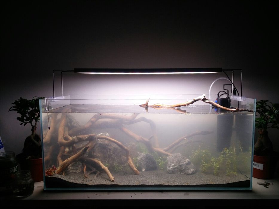 Eilen käynnistelin siis toisen akvaarioni. Akvaario on 98-litrainen Opti White, mitoiltaan 80x35x35. Siihen on tarkoitus tulevaisuudessa tulla kääpiöpallokaloja n. 10 kpl, mutta ensiksi haluan panostaa maiseman suunnitteluun ja kasveihin. Ja toki rauhassa kypsyttelyyn. Tekniikasta ainoastaan CO2 puuttuu vielä, mutta se on tulossa piakkoin. Sen kohdalla vielä pohdin, että millaisen haluan.