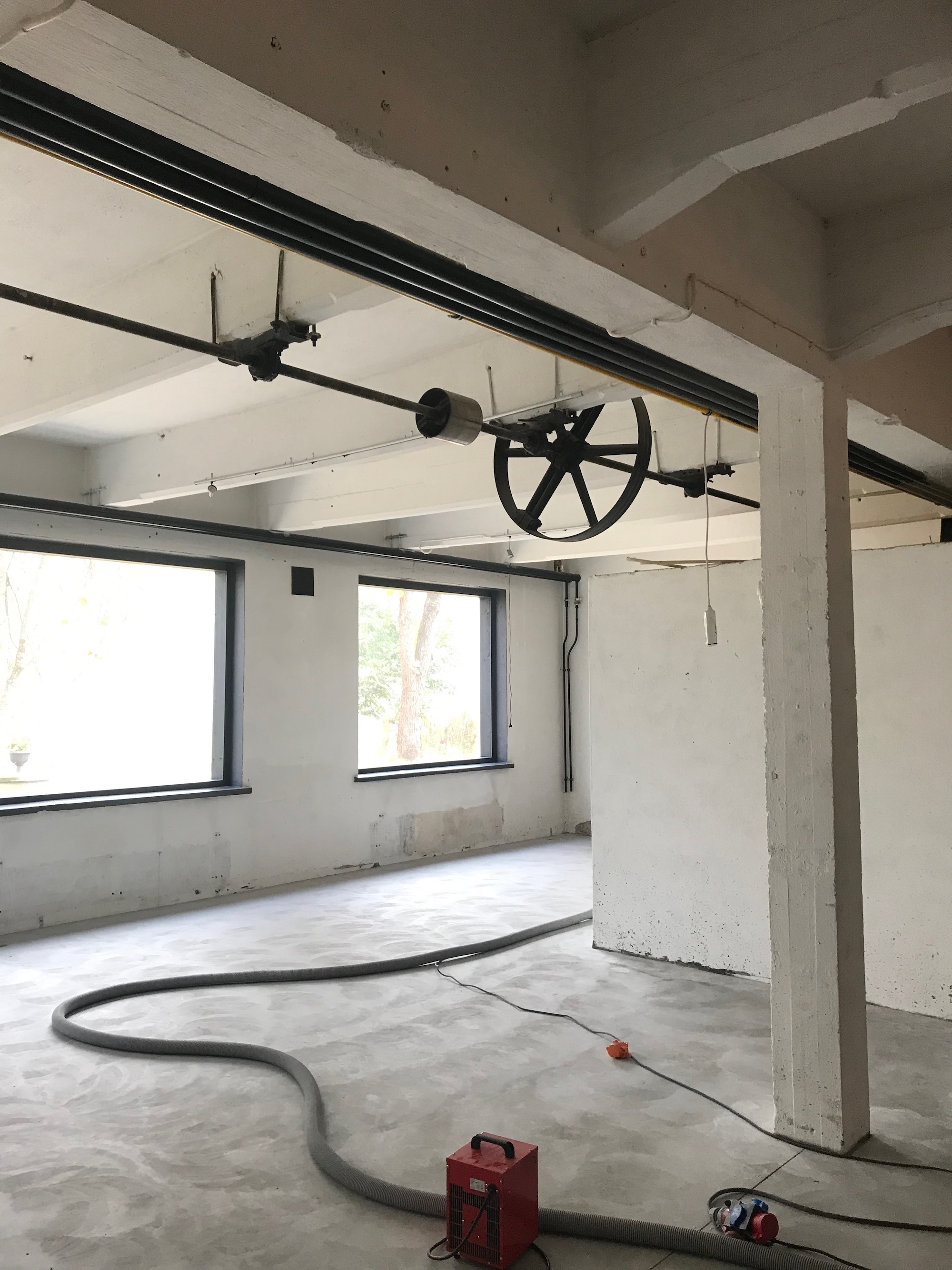 Tänään lattiat valaneen firman mies tuli kiillottamaan betoneita. Siellä hän on juuri hiomassa akvaarion tekniikkahuoneen lattiaa tuolla kulman takana. Lupaili, että tiistaina olisi lattia valmis ja sitten voi alkaa valamaan itse akvaarion pohjaa.