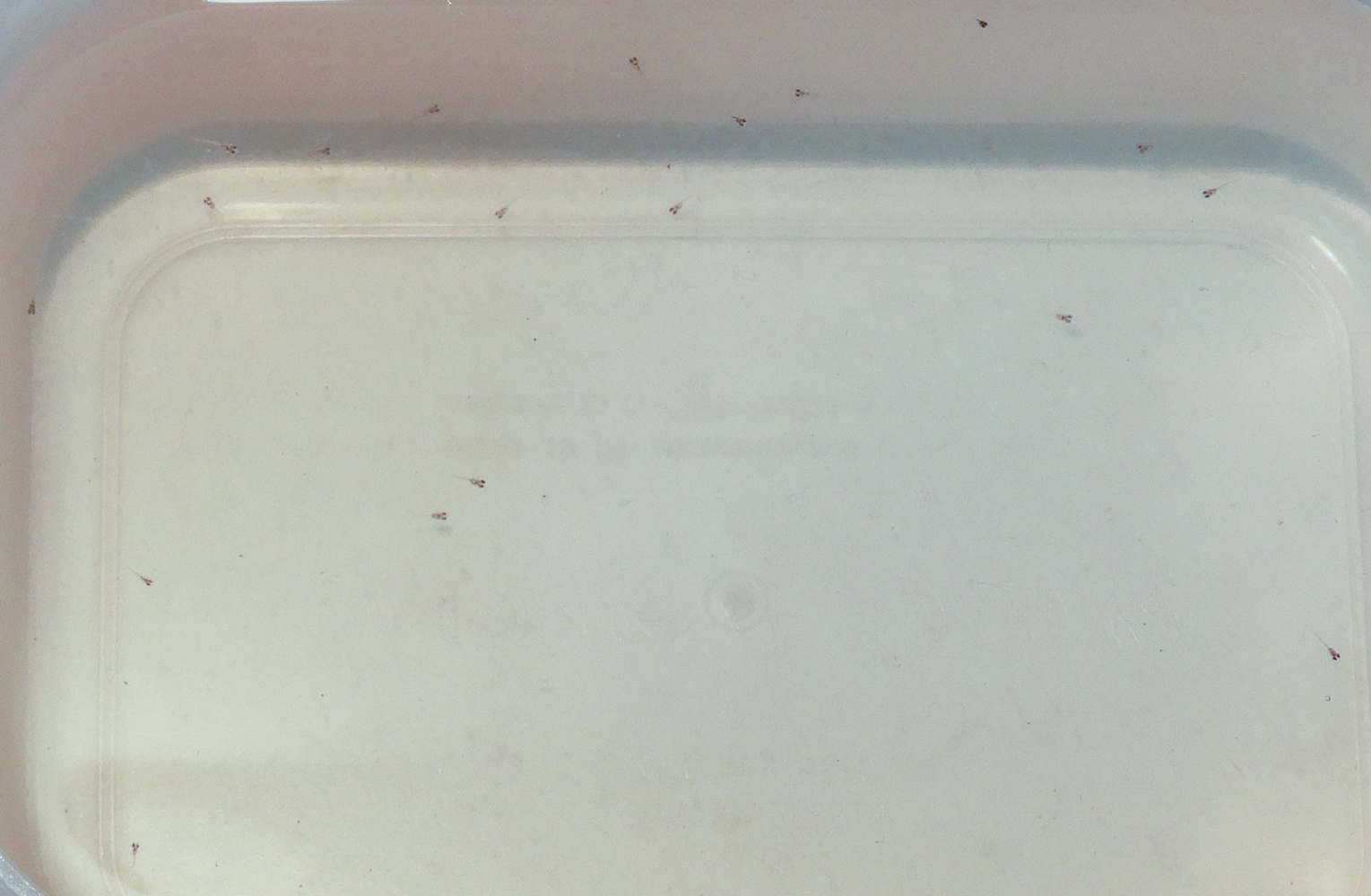 Tarjosin tänään ensimmäistä kertaa mikromatoja, mutta niitä ei syöty. Kiinnostuneena muutama poikanen kyllä tutkiskeli niitä mutta eivät pitäneet matoja ruokana. Kun niitä ei ollut syöty yhtään parissa tunnissa, yritin imeä kaikki madot pois pohjalta pipetillä, etteivät kuollessaan pilaa vettä. Seuraavaksi tarjoan mikromatoja vasta, kun poikaset ovat isommassa tilassa, mihin ei mene enää montaa päivää.