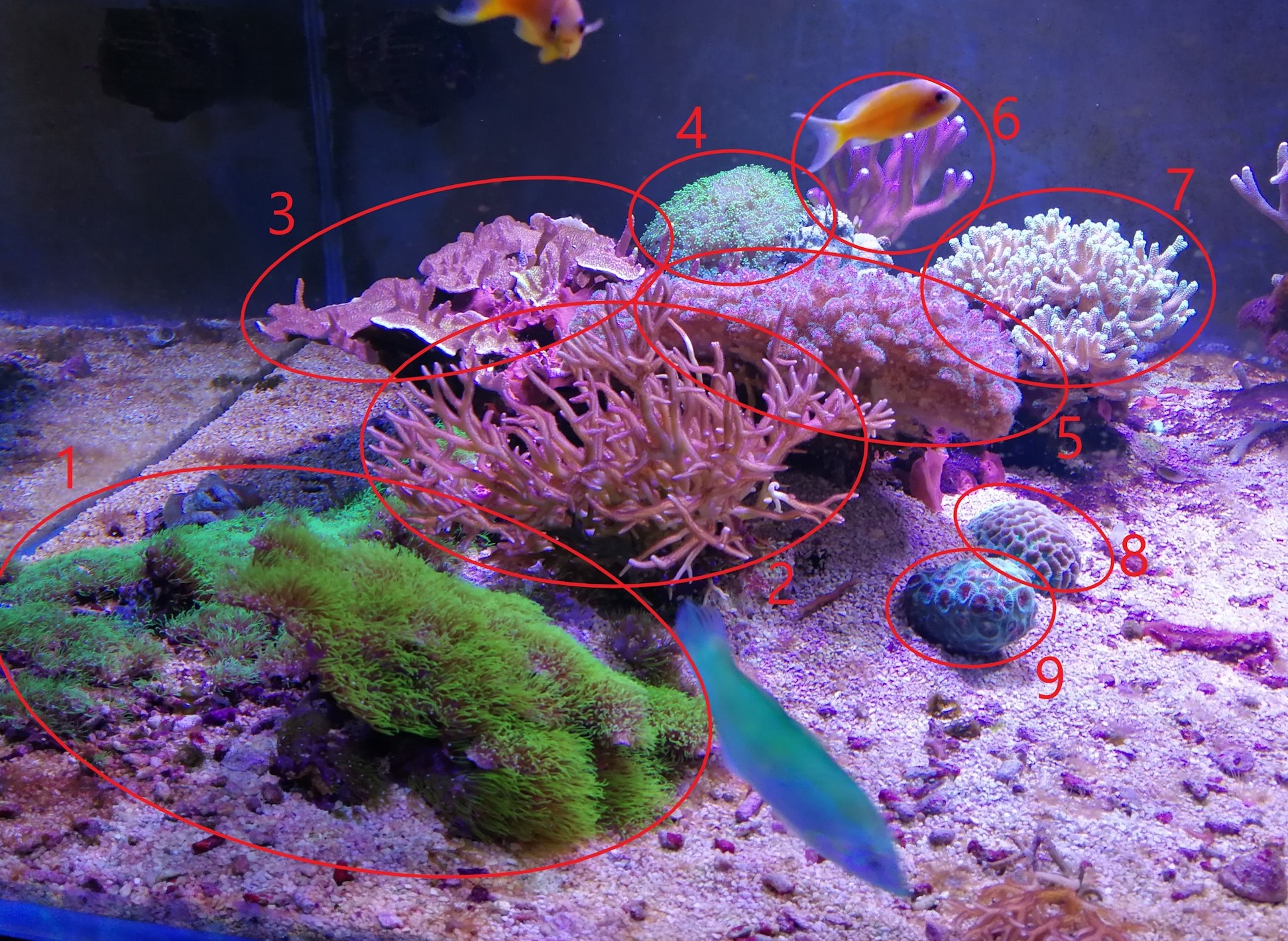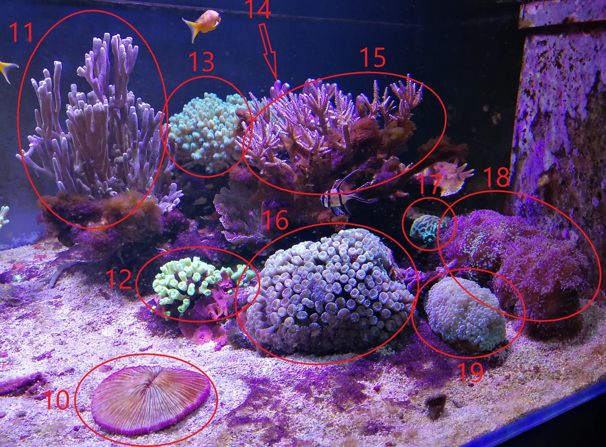 Altaassa on runsaasti mm. Aiptasiaa ja kuplalevää, joten suosittelen tarkastamaan korallit huolella ennen kotiuttamista. Löytyy myös bristlewormeja ja Asterina - meritähtiä. Flatwormeja en ole altaasta tavannut.