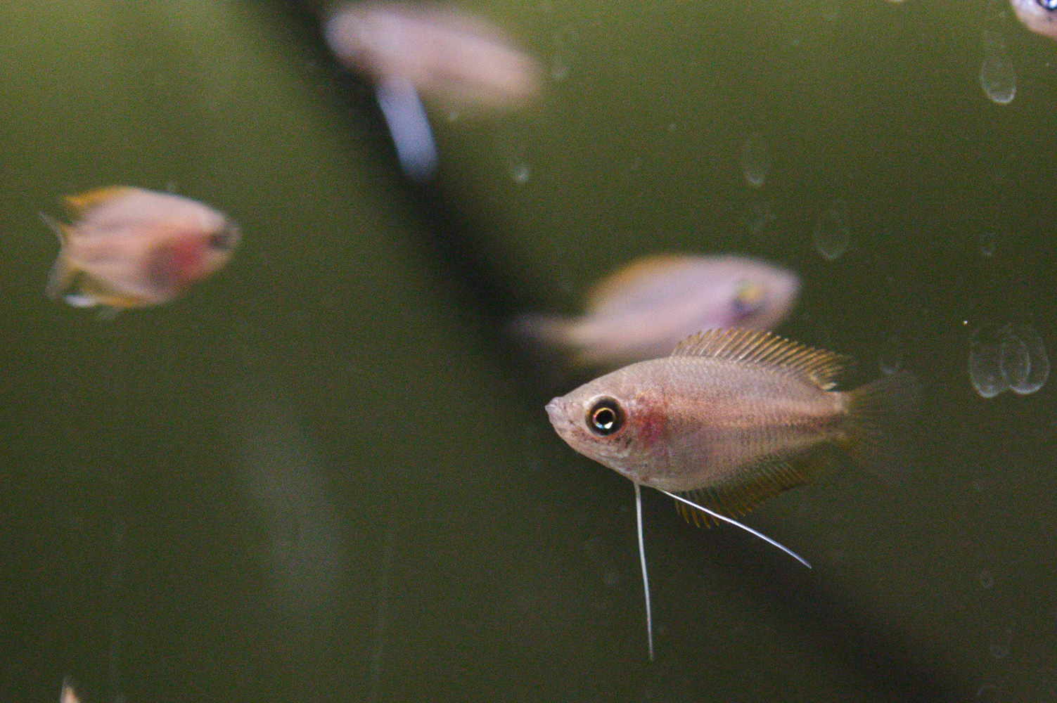 Kyseessä oli tosiaan rauhallinen allas, jossa hunajarihman lisäksi oli vain sukarapuja ja chilirasboroita. Paljon pinta- ja muuta kasvillisuutta, mantelipuun lehtiä, levää laseissa ym., joista vauvat varmaankin saivat syötävää. Koko porukka sai suht säännöllisesti pakasteartemiaa/kyklooppia.