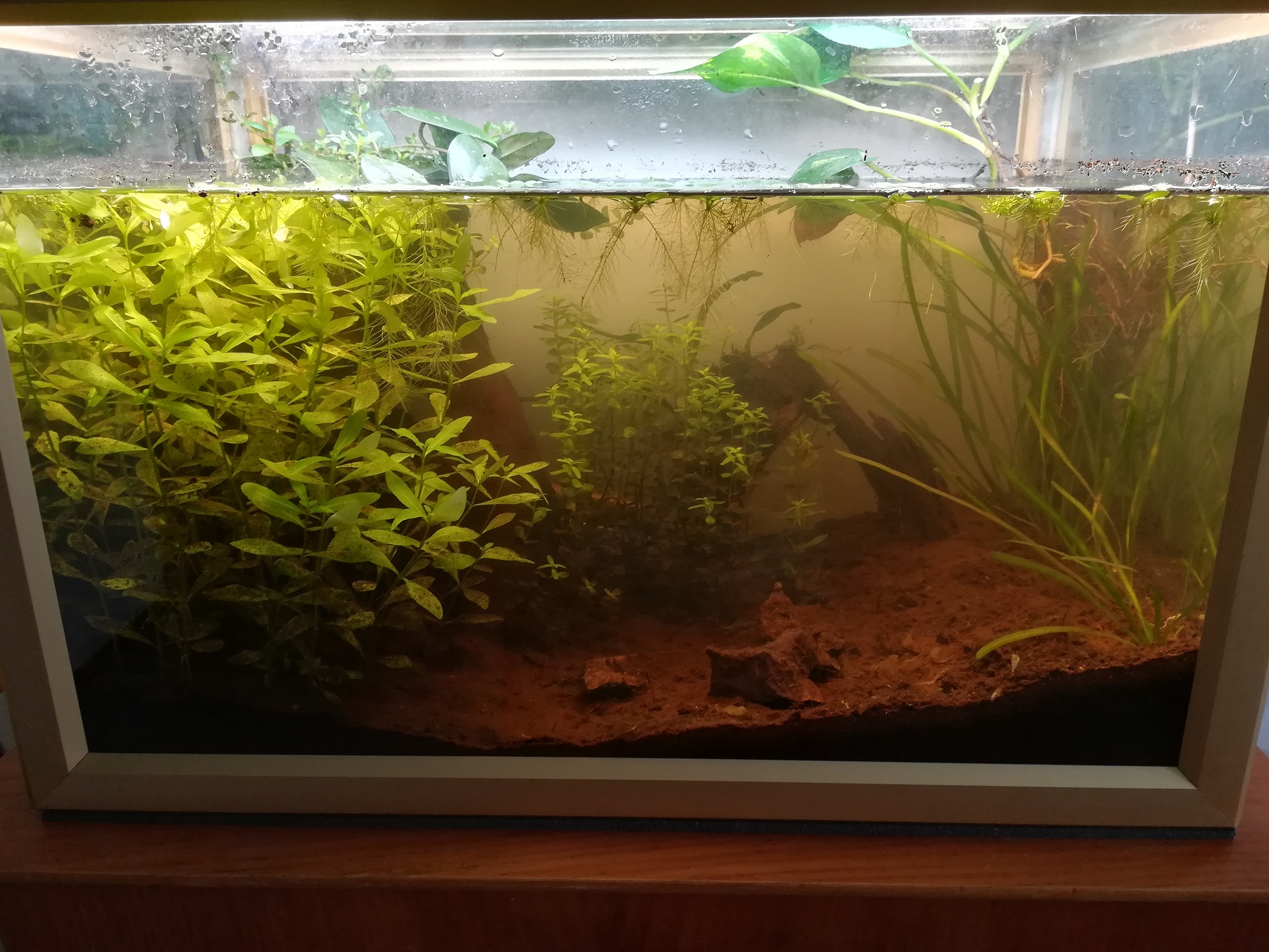 Vien taas tässä jossain vaiheessa vettä liikkeeseen testattavaksi tarkemmin. Kuvassa akvaario tänään, kun olin karsinut puolet intianvesitähdikkipuskasta ja pistiasta pois. En tajunnut ottaa kuvaa ennen karsimista. Vesi on aika ruskiaa. Anteeksi veden pinnan yläpuoliset sameat lasit, ei ole kauhean nättiä.
