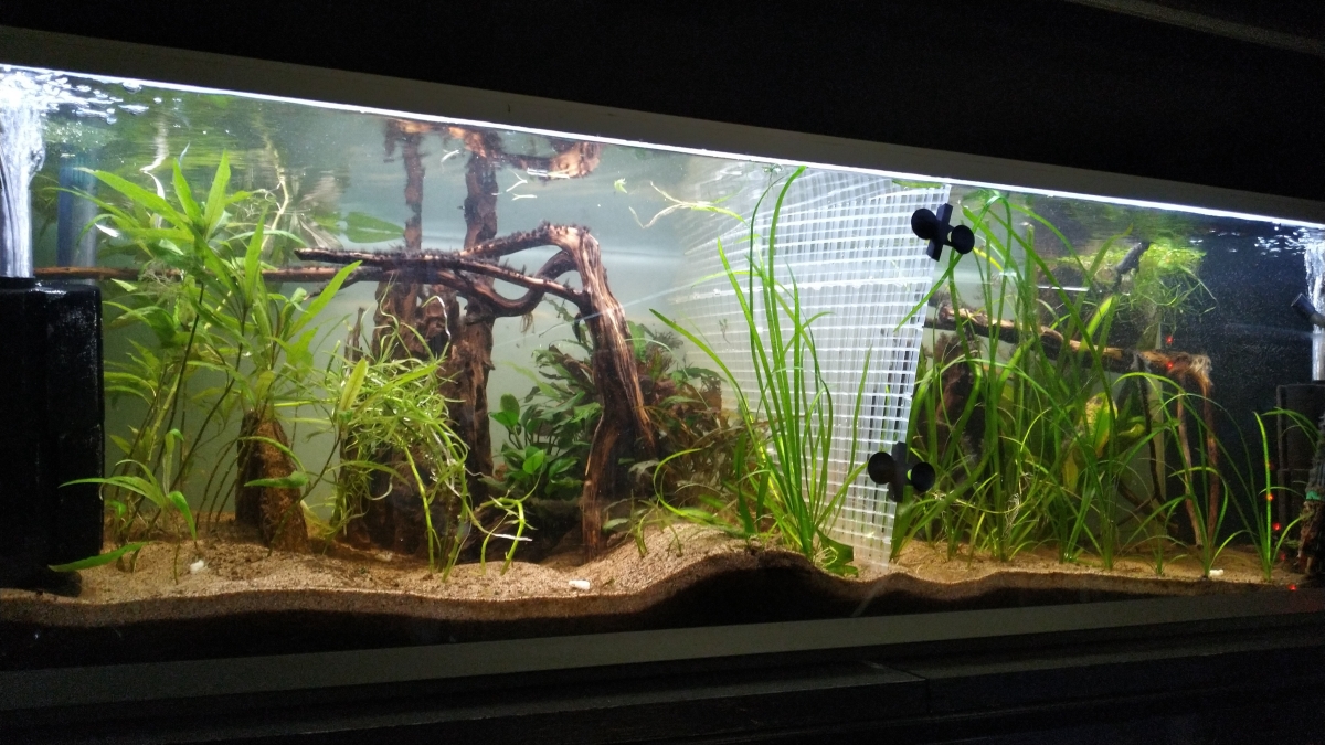 Varmuuden vuoksi kuitenkin virittelin akvaarioon väliseinän jotta tulokas saa kotiutua rauhassa muutaman päivän ja tutustuminen tapahtuu "valvotuissa" oloissa ilman uhreja.