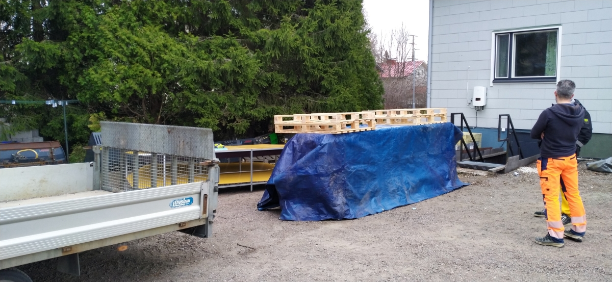 Trailerissa on kippi ja tuollainen ajoramppi eli me laitettiin rivi lavoja joiden päälle uretaanilevyjen paloja joita pitkin tuo oli aika helppo porukalla liu-uttaa kyydistä pois.