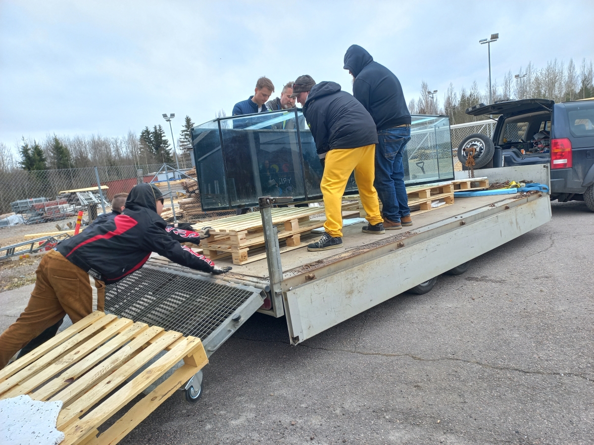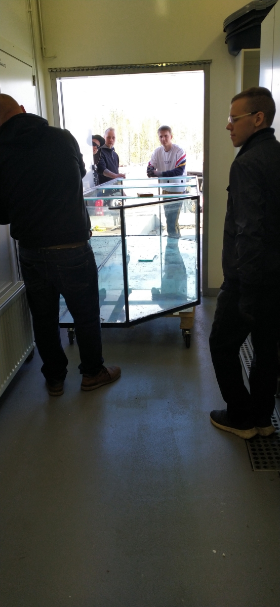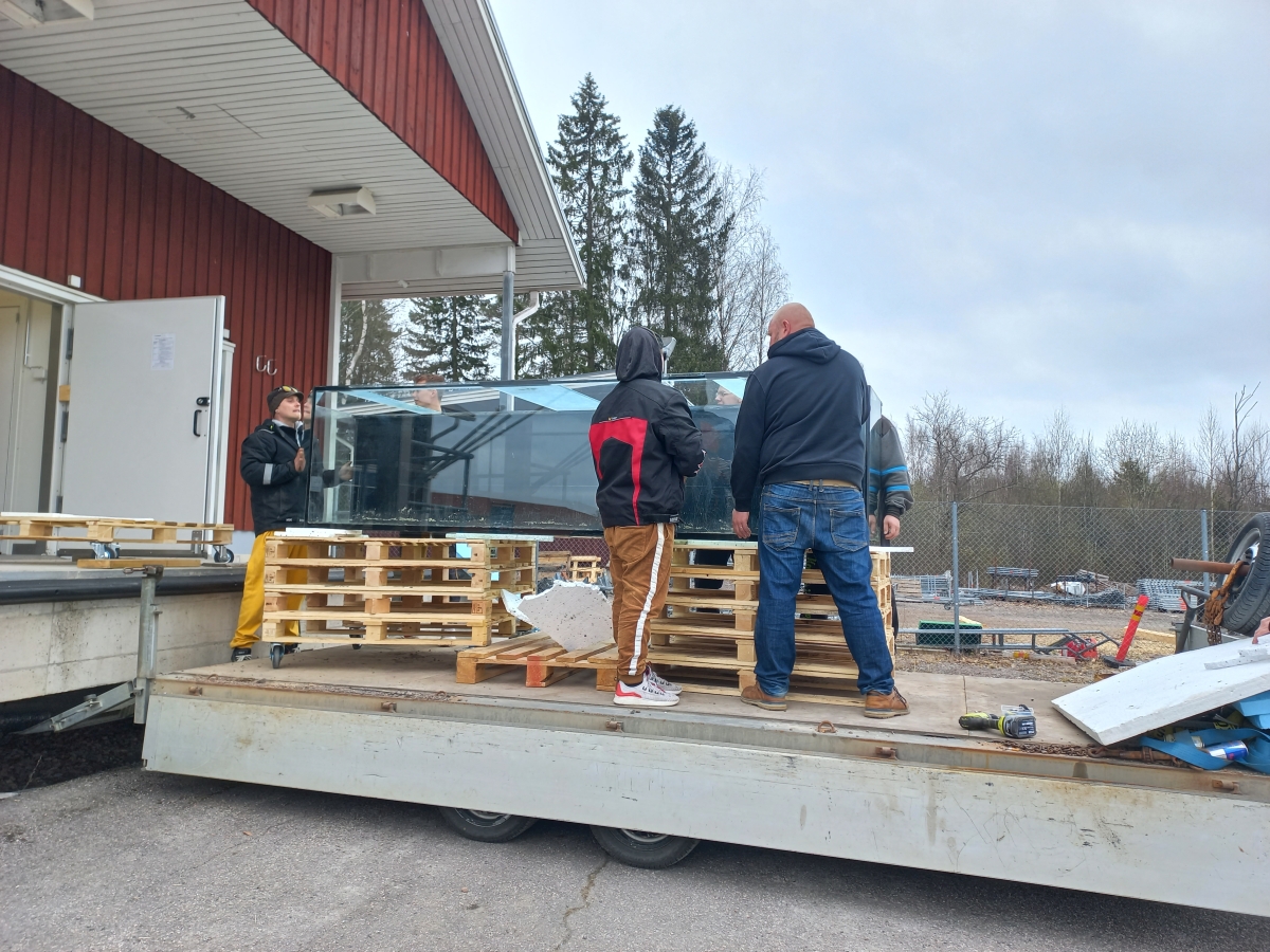 Sitten akvaario pulkan kyytiin ja pulkka rampille.