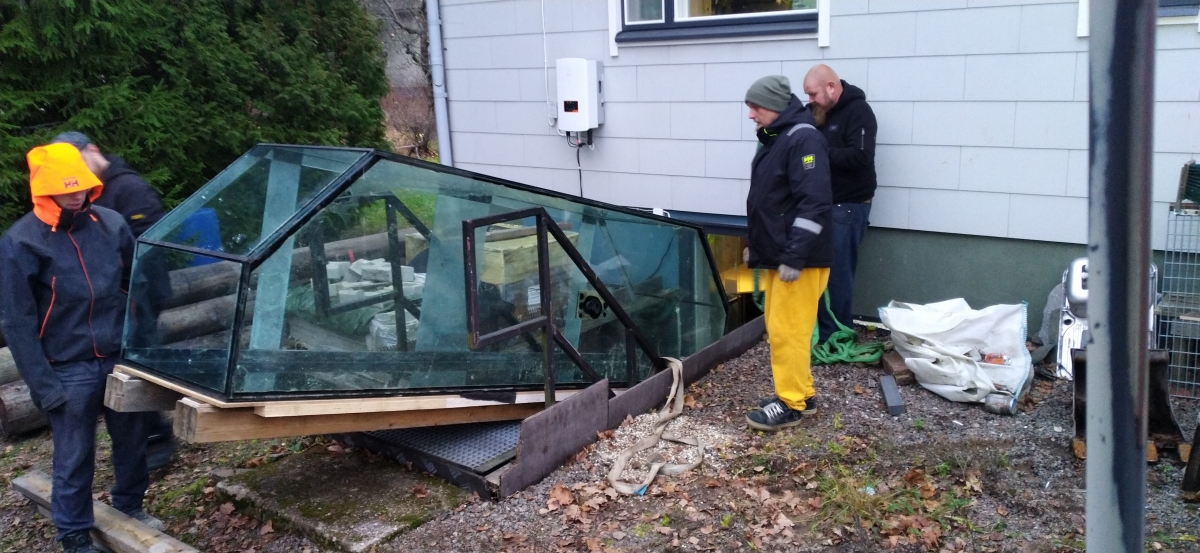Ensin se käydään hakemassa, seuraavaksi hieman pöydän ja viemäröinnin viritystä ja lopuksi siirto sisälle.
