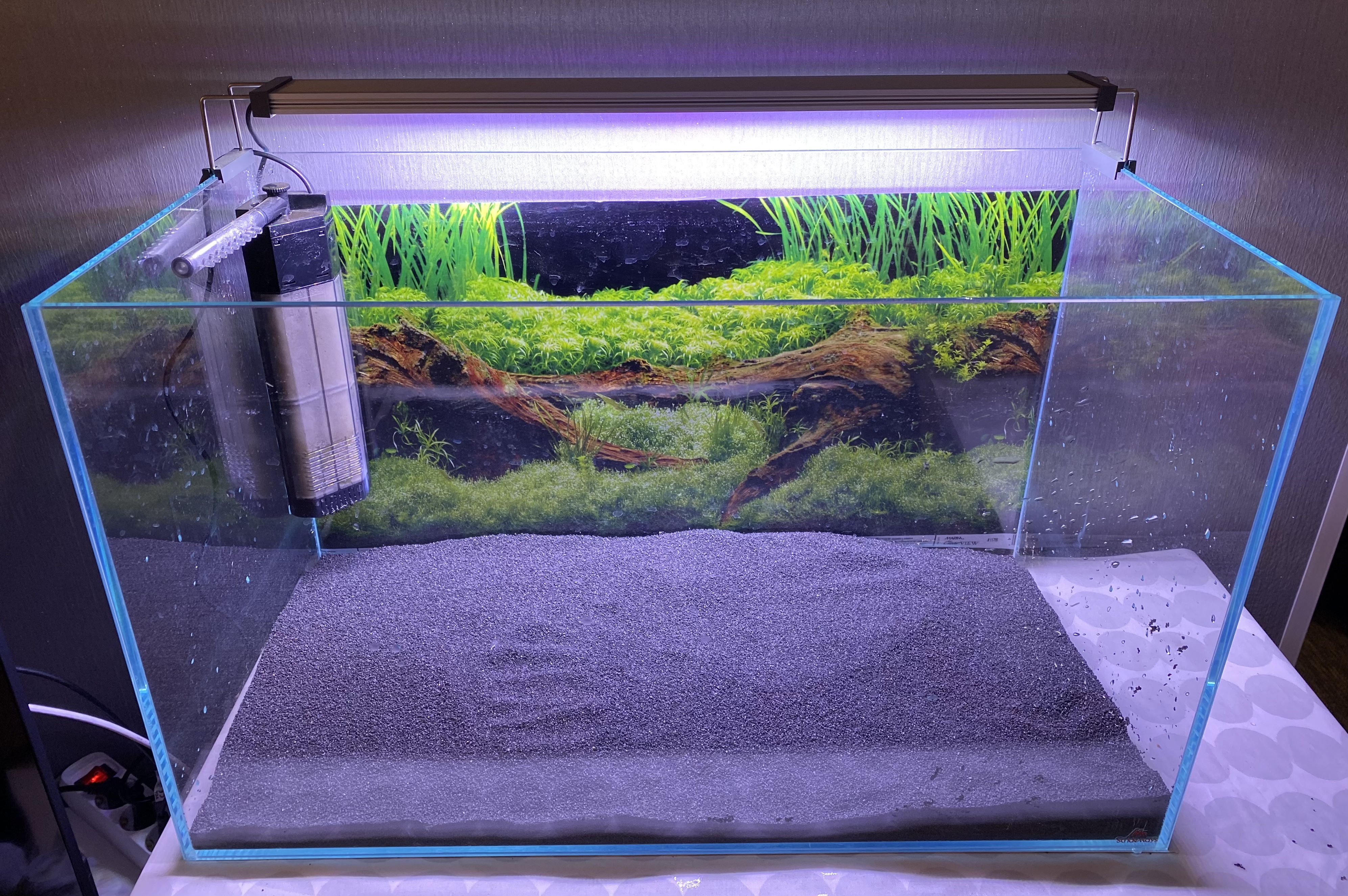 Haaveeni 60-litraisesta aasia-teemaisesta akvaariosta on nyt päässyt alkuun: akvaariosetti ja ensimmäiset pohjamateriaalit saapuivat kuukausi sitten!