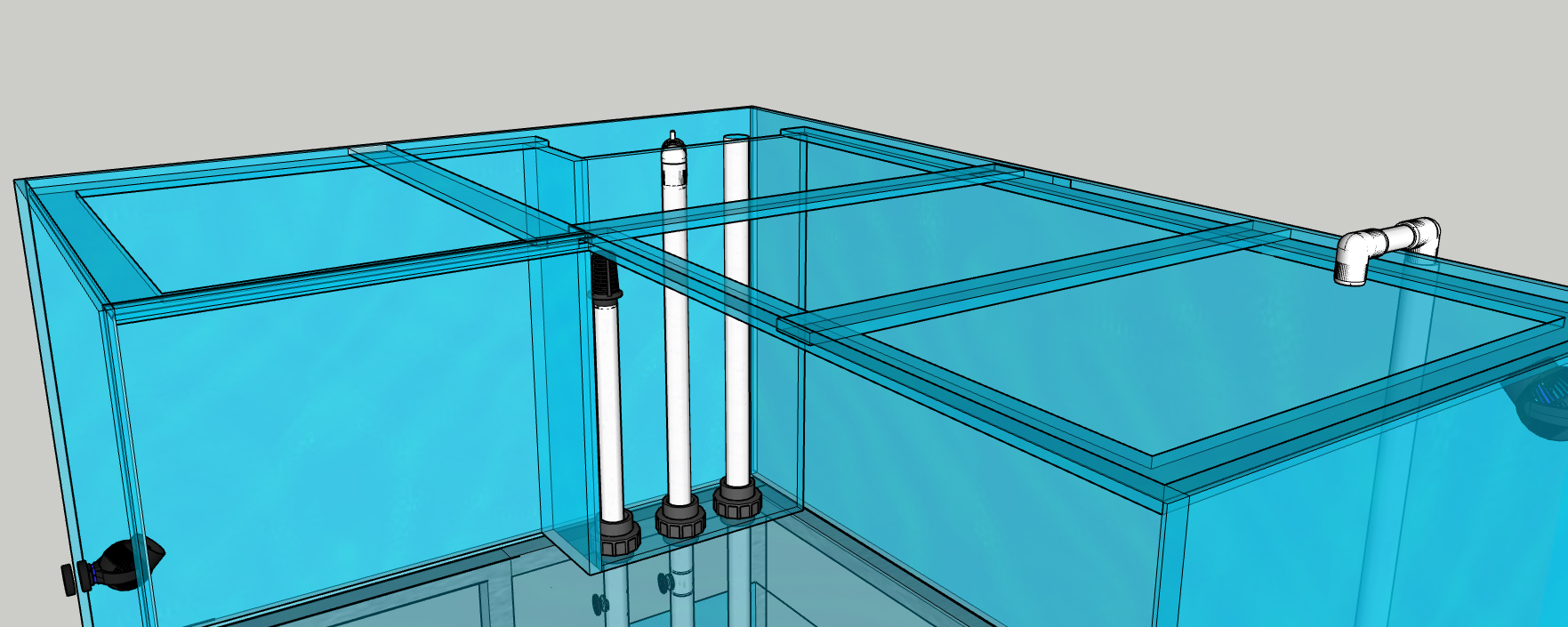 Tässä se suunnitelma suurin piirtein on, molemmat laatikot ovat mitoiltaan 37 cm x 13 cm, korkeus tuohon lokoseen on 70,5 cm. Ylimmät hätäputket ovat noin 71,5 cm korkeita. Kuvaan piirsin molemmat ajattelemistani vaihtoehdoista, Herbien ja Bean Animalin. Lokosiin meinasin laittaa jonkinlaiset kammat, jos niille on tarvetta. Laatikoiden eteen tulisi 3d-tausta, ja tuohon väliin jäävään osuuteen ajattelin virittää joko sisäsuodattimen tai streamerin työntämään vettä alaspäin taustan ritilöistä pohjaa kohti. Näin ei taustan taakse jäisi mitään mujua notkumaan vaan kiertoa tapahtuisi sielläkin.
