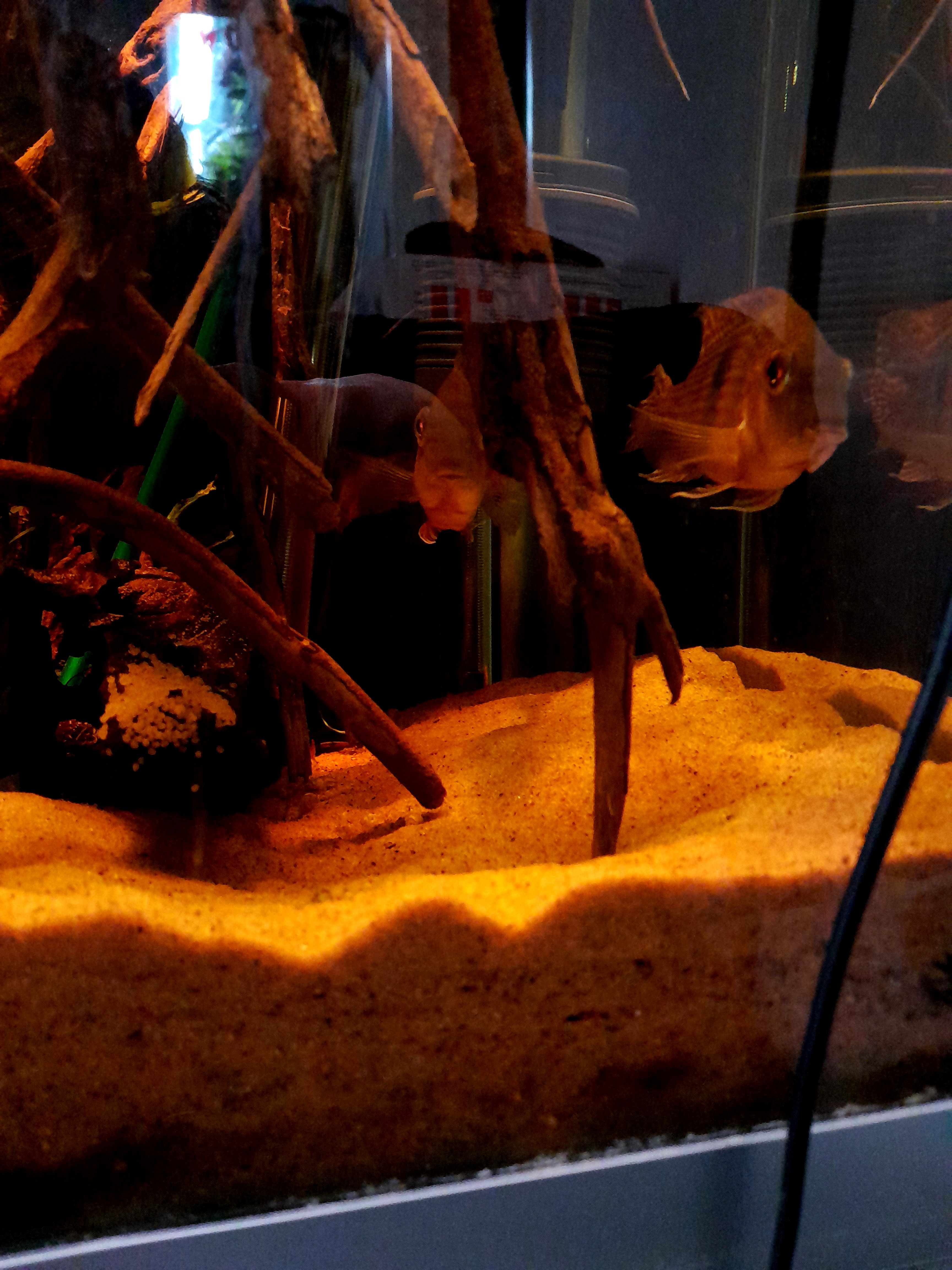 Nyt on ensimmäiseksi kuteneen parin lapset käyneet ulkoilemassa, tosin parin minuutin jälkeen vanhemmat nappasivat poikaset nopeasti takaisin suojaan. En saanut harmikseni kuvattua poikasia, se aika meni ihastellessa! :) Vanhemmat tuntuvat syövän paremmin jopa poikaset suussakin, saavatkohan poikasetkin samalla ravintoa vanhempien aterioidessa? Viritin letkunpätkän ja syötin ruiskulla kokeeksi liotettua artemiaa, lähinnä tarkoitus totuttaa vanhemmat letkun olemassaoloon ja saada ne ymmärtämään sen tarkoituksen. Ainakin toinen tonkijoista näytti ymmärtävän jujun, napsi artemiahötöä hiekan päältä. Mietityttää, onko vaarana että poikasia imeytyisi ulkosuodattimeen? Eheim 2260 imuputki on siinä lähellä, josko nostaisin sitä kauemmas tai virittäisin vähän ylemmäs?