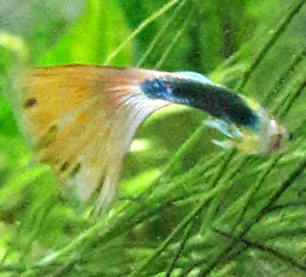 Olisipa aikaa perehtyä noihin periytyvyysasioihin... Kun on sekaparvi kaloja, niin ainakaan minulla ei ole aavistustakaan, mikä naaras kävisi (vai kävisikö mikään) jonkin tietyn koiraan pariksi, että saisi aikaiseksi edes jonkin verran tietynnäköisiä kaloja. Omien kalojeni joukossa lempparini oli alun perin keltainen tuxedo, mutta mukana tulleista poikaista yhdellä on nyt komea cobraväritys. En lakkaa hämmästelemästä värin monipuolisuutta. Musta väri pysyy koko ajan ennallaan, mutta muuten pyrstö on välillä kirkkaan auringonkeltainen, seuraavassa hetkessä hehkuvan oranssi. Pyrstön tyvellä olevasta värilaikusta en ikinä ehdi saada selvää, se vaihtaa niin nopeasti sinisestä vihreään ja takaisin. Ja samaa väriä näyttää olevan kyljilläkin, se vain näkyy ainoastaan tietystä kulmasta. Ihan käsittämätöntä, miten kalan väri vaihtuu, kun se ui eri valaistuksissa ja se näkyy eri katselukulmista. Noita täytyisi ehdottomasti saada lisää.