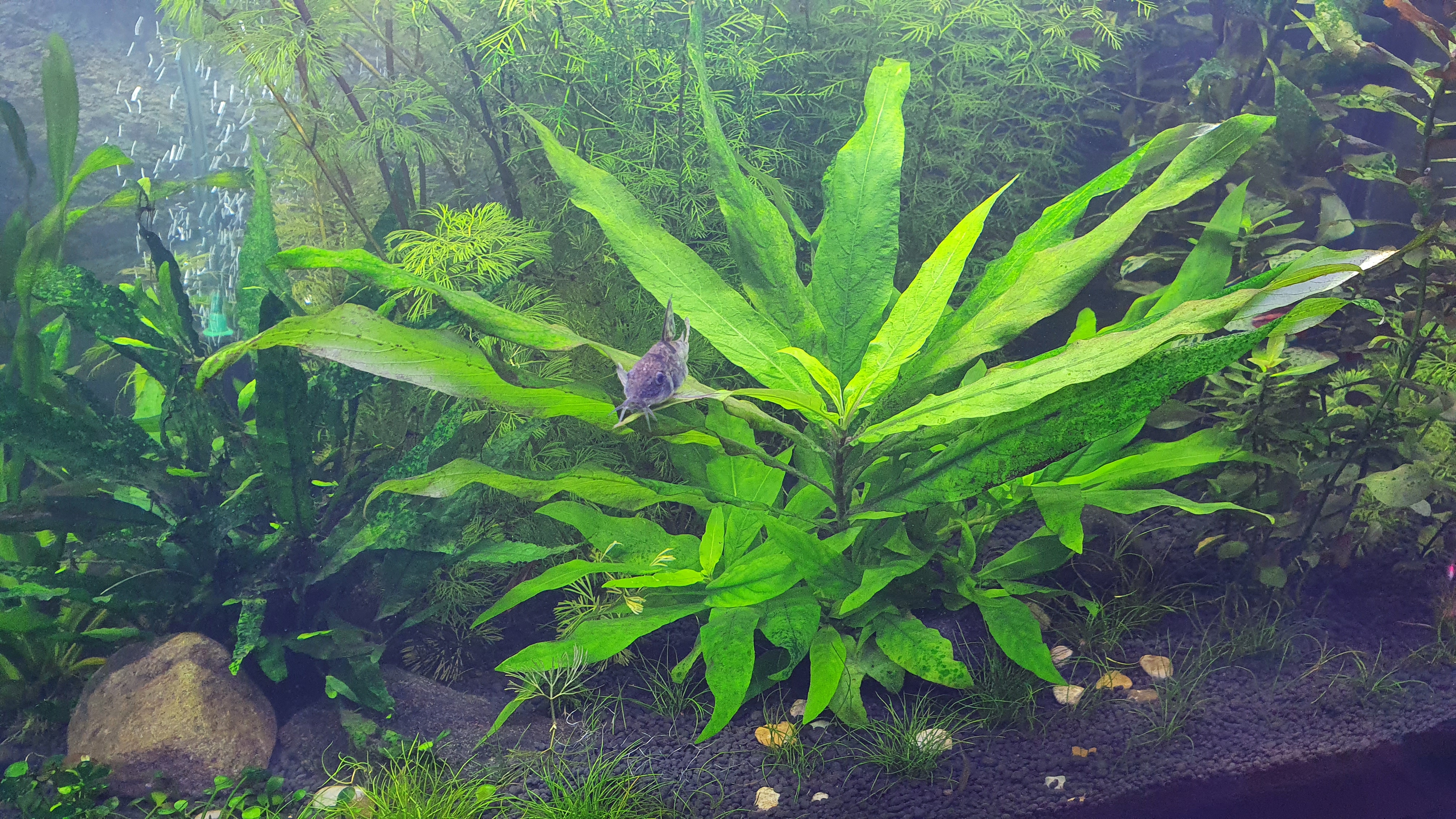 Isoimmat monniset on noin puolitoistasenttisiä, melkein 2. Mutta niillä on yhä läpikuultavat mahat, muutoin ovat aikuisen näköisiä. Ne sopeutuivat arvatenkin hyvin ja nauttivat kovasti keskellä olevasta mangroven juurakosta, jossa piileskellä, ne myös tykkäävät puhdistaa sitä. Neontetra kävi nyppäisemässä niitä, olisiko noista ruoaksi mutta päätteli että ovat liian iso suupala. Tuosta taistelukalasta ei ole kyllä mihinkään, se ei varmasti tee pahaa kärpäsellekään, eihän sille edes ruoka maistu. Jotenka ainakin yksi "hyvä" puoli siinä on, hah. Sukaravuillakaan ei varmaan olisi mitään pelkoa taistelukalasta, ehkäpä se on myös niin rauhallinen luonne. Sen nimeksi sopisi paremmin Marvin, eikä Merlin, niin masentunut se on.