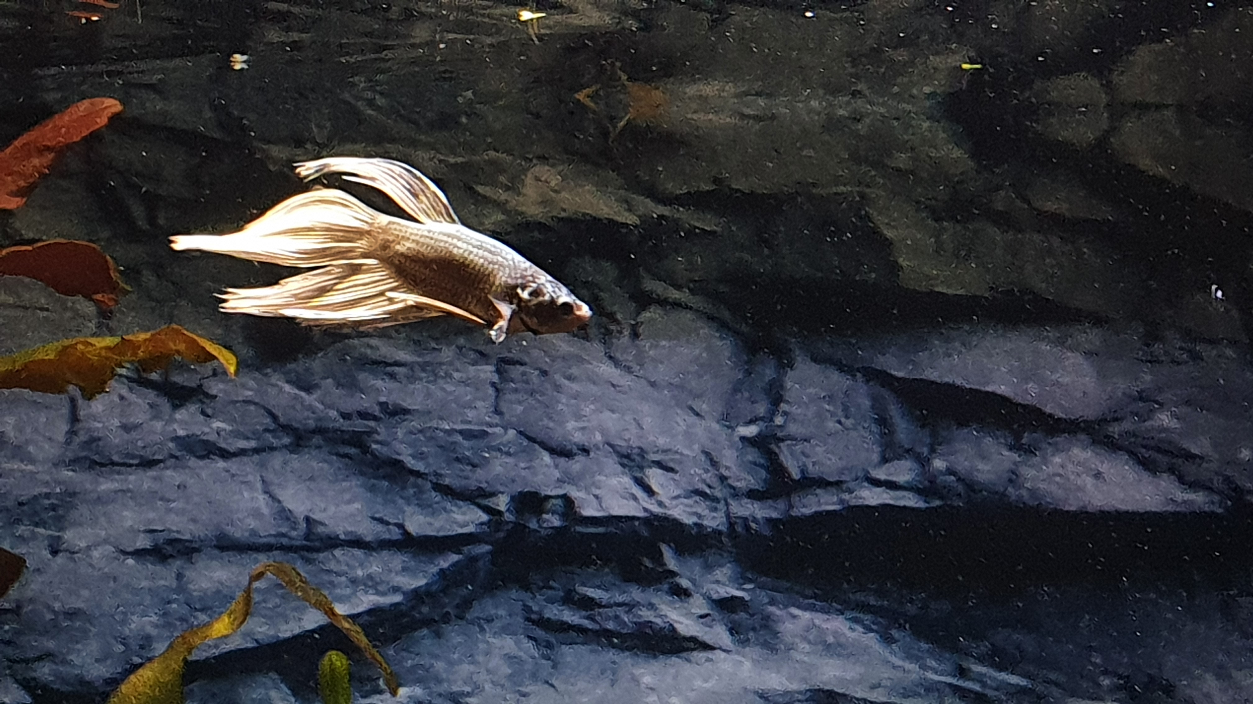 Taistelukala tylsästi enimmäkseen hengailee suodattimen takana piilossa. Mutta nyt kun vaihdoin vettä niin näyttää uiskentelevan taas pitkin tankkia. Oli jo tarkoitus eilen vaihtaa vettä mutta ostinkin kalan. Joo kala on hienohelma, sillä on kuin pitkä silkkinen viitta, mistä keksin nimen Merlin. Silti tuntuu oudolta tässä vaiheessa vielä nimetä kaloja.