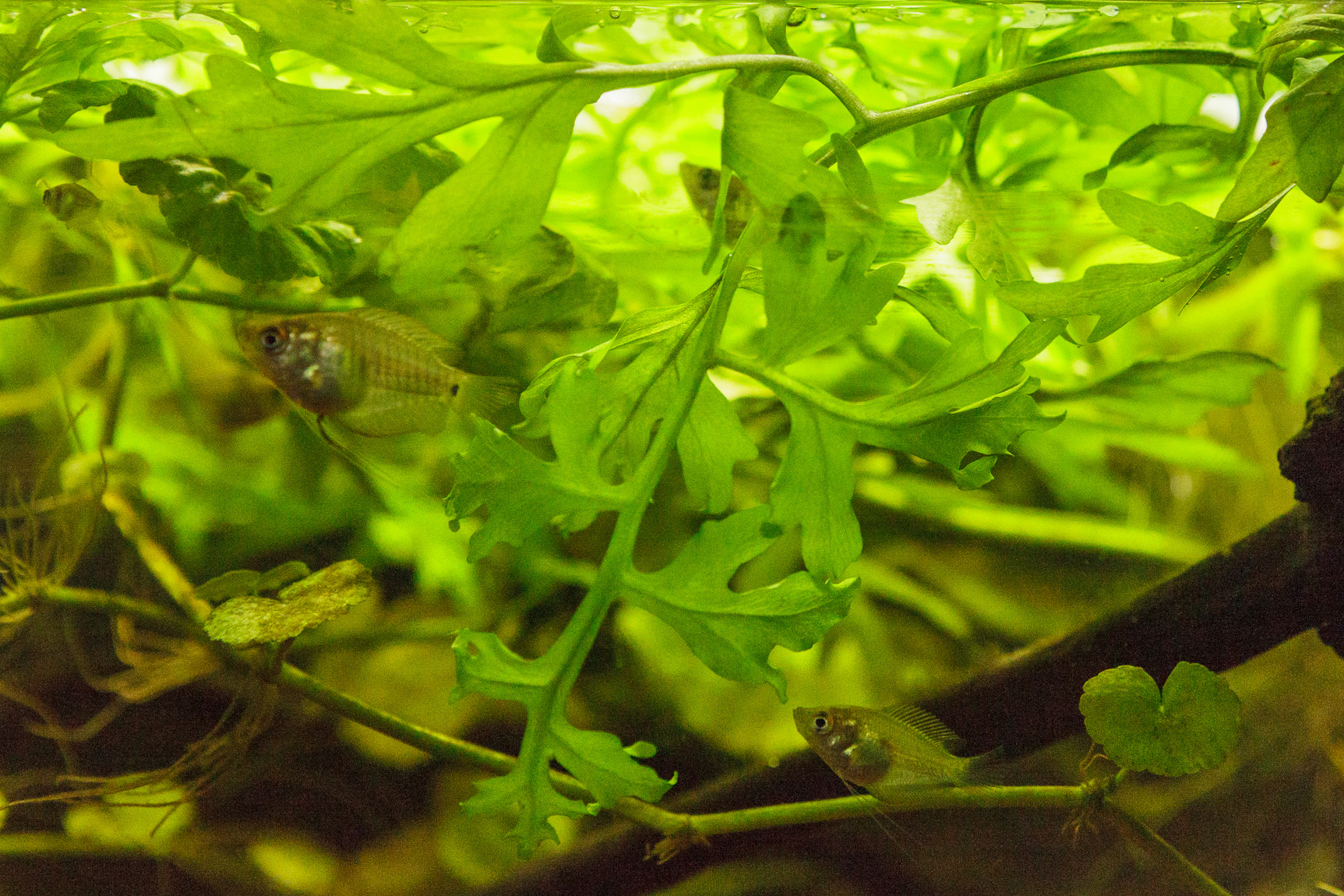 Lämpötilaa nostin taas asteella. Nyt päivällä täydet 30 ja yöllä 28. Tästä en enää nosta, vaan pidän näissä lämmöissä kunnes ovat jokseenkin täysikasvuisia, jolloin voi tiputtaa muutamalla asteella. Vesisaniaiset ovat valloittaneet akvaarion. Ilmeisesti imevät ravinteita niin paljon, että pistia ja konnanputki kasvavat huonosti.