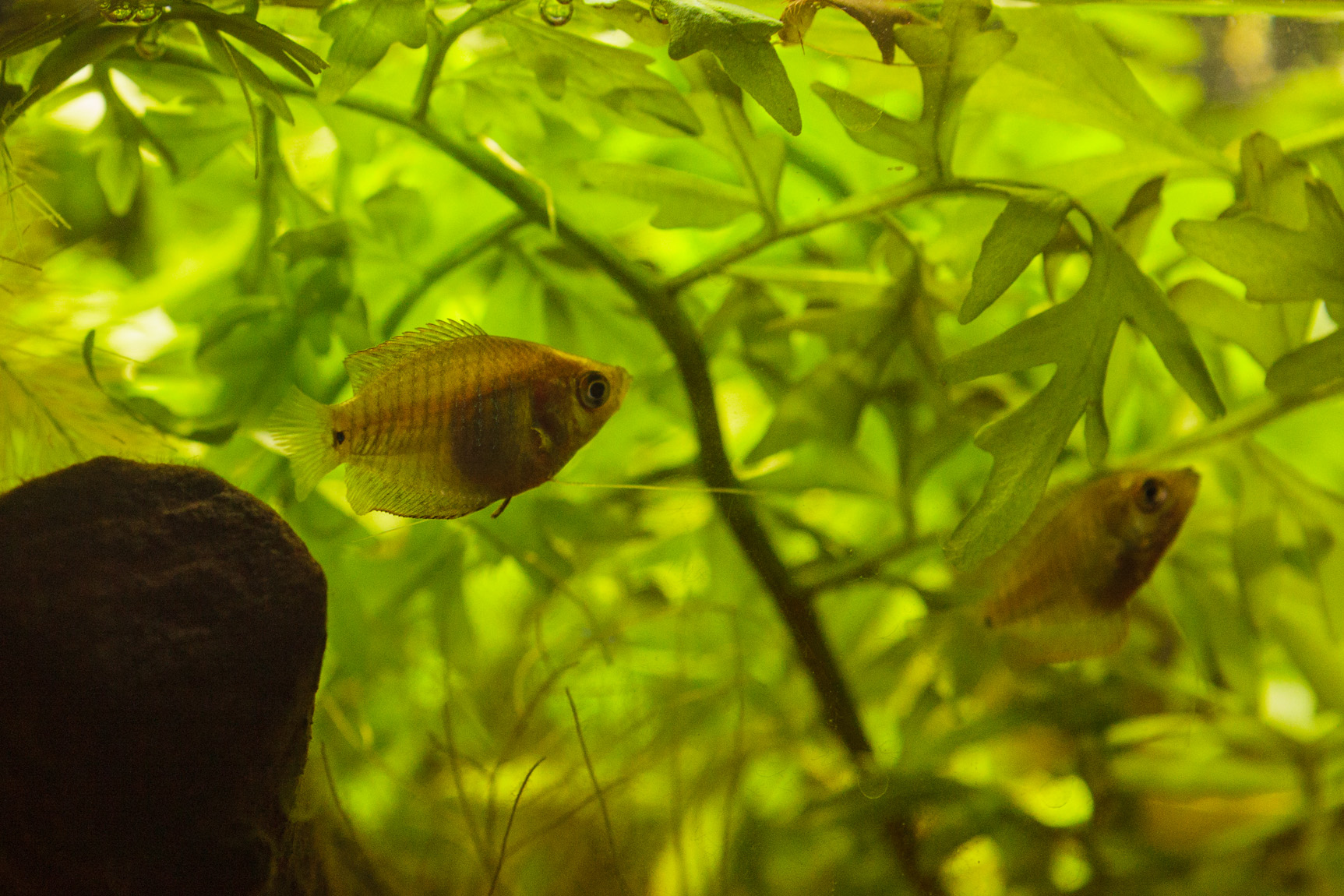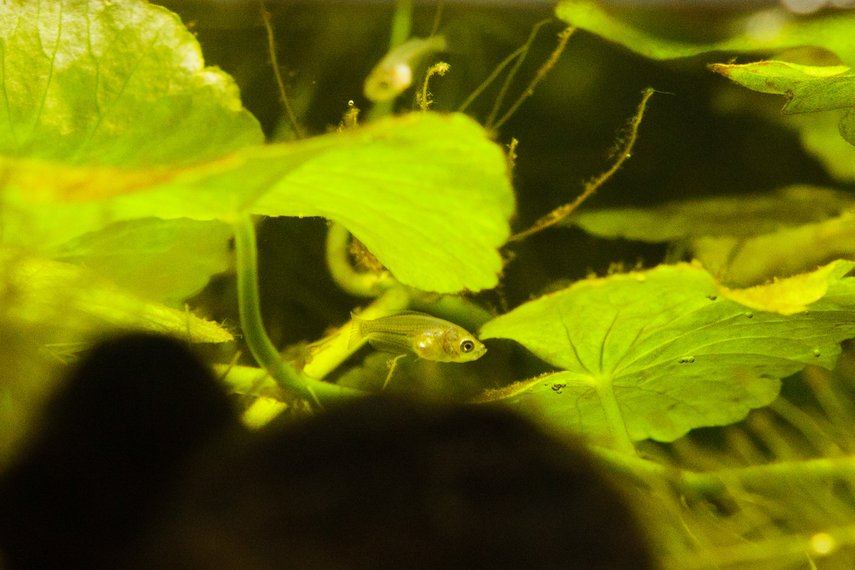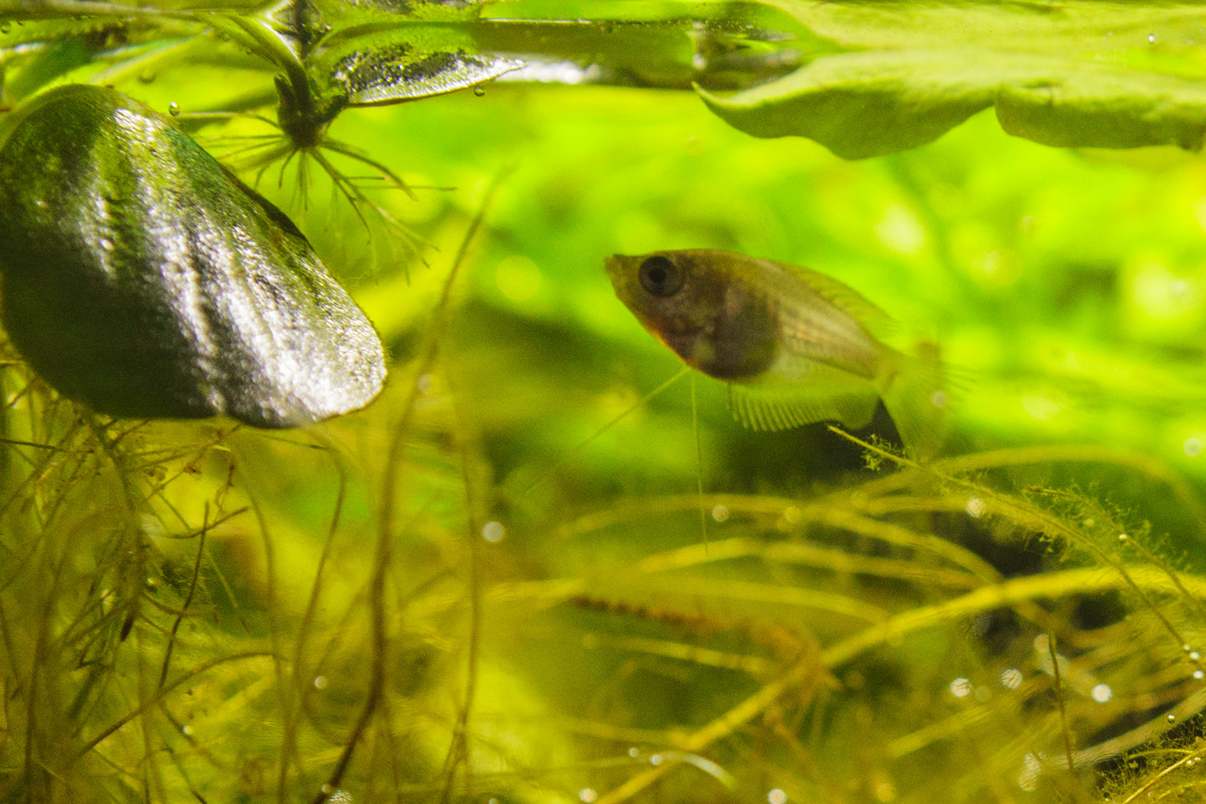 Kasvatusakvaario tulee toiseen käyttöön ja tyttö pääsi isompaan akvaarioon (135 l, mutta ei täynnä pinnan yläpuolelle kasvavien kasvien takia), missä jo asustavat tytön isä Sirius, äiti Lea, Siriuksen veli Kolmijalka ja Siriuksen siskot Lumi ja Siiri. Kolmijalka on saanut nimensä siitä, että sillä toinen rihma on kaksihaarainen, joten näyttää siltä kuin sillä olisi kolme rihmaa. Uudella tytöllä ei ole vielä nimeä. Tässä se on uudessa kodissaan: