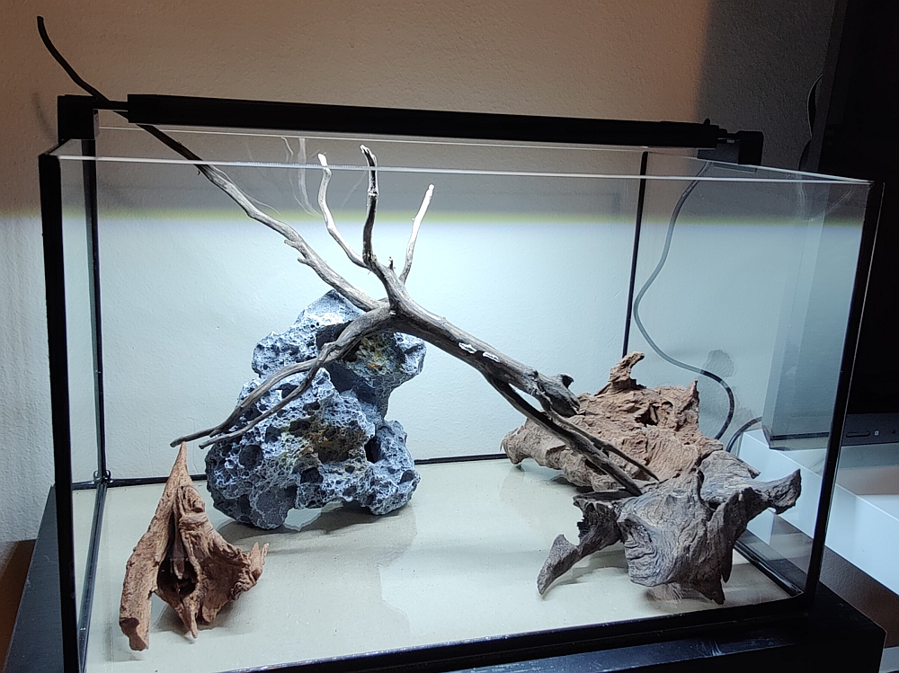 Kasvit ovat selvinneet ainakin yhden päivän hengissä. :D Tänään vielä parin tunnin verran mylläsin akvaariota. Poistin jatkopalan suodattimesta, jotta saisin pohjalle sittenkin lisää tilaa. Lisäksi siirsin toisen ison puupalan vastakkaiseen nurkkaan ja nyt kokonaisuus on eläimille varmasti kivempi. Nuo molemmat isot puunpalat ja kivi ovat onttoja. Olen yrittänyt järjestää ne sillä tavalla, että eläimille olisi paljon tilaa ja samalla myös piiloja joka suunnasta. Nyt altaassa on tilaa uida käytännössä päästä päähän, vaikka kuvista onkin varmaan vaikeaa nähdä sitä. Osa kasveista irtosi tämän säädön aikana ja istuttelin niitä uudestaan. Suodatin ja lämpömittari näkyvät nyt aika rumasti, mutta ainakin niiden sijainnit on funktionaaliset.