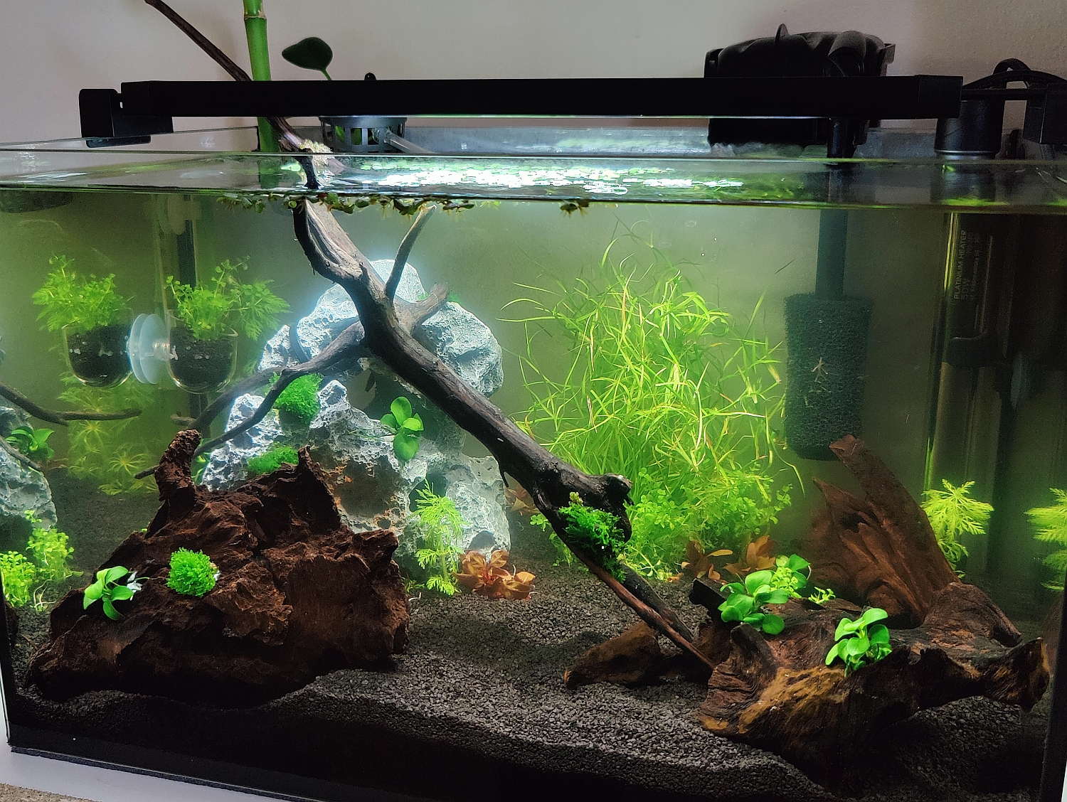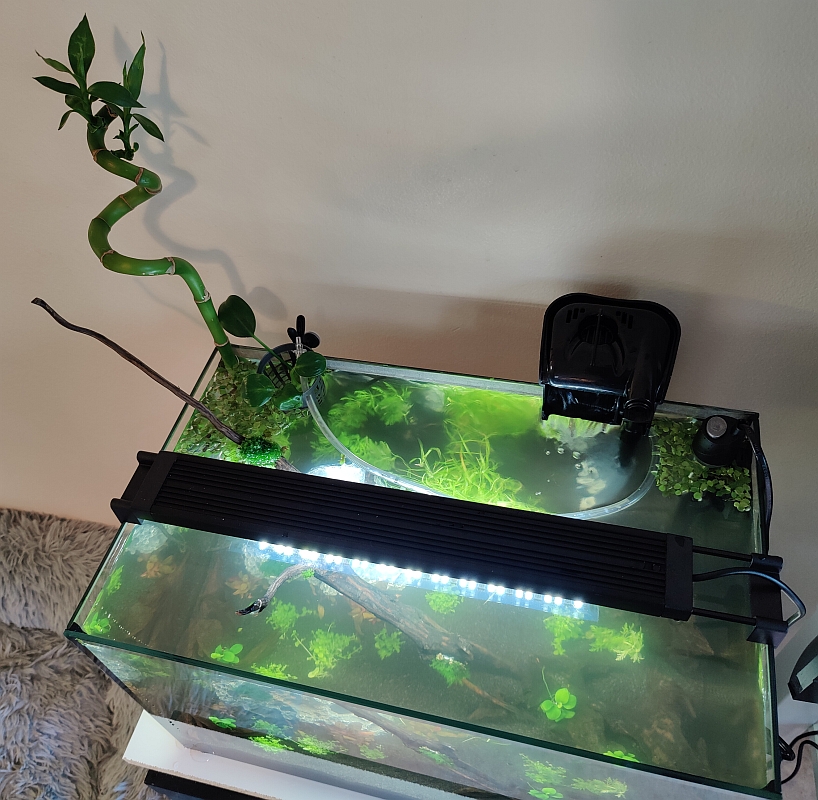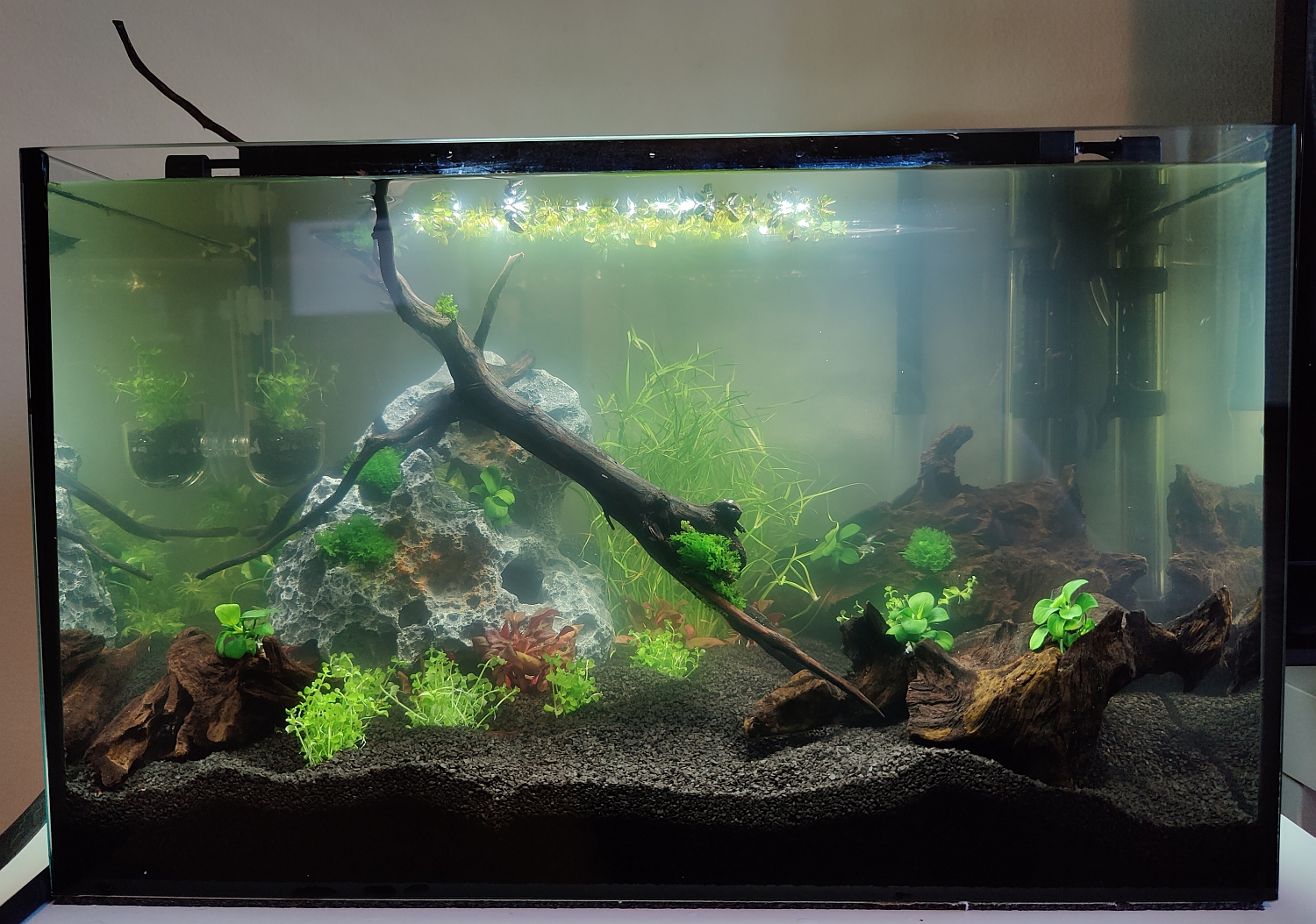 Suurinta päänvaivaa aiheuttavat tällä hetkellä pintakasvit, jotka pyörivät ärsyttävästi suodattimen takia, jos en sulje niitä nurkkaan pinnalla kelluvan juurakon avulla. Täytyy kyllä keksiä joku parempi ratkaisu niille. Vaikka sellaiset jotkut imukupilla kiinnitettävät renkaat. Heitin myös yli puolet pintakasveista roskiin, kun niitä oli jo niin paljon ja haittaavat valoa. Istutin tänään uudelleen kasveja niin että ne saisivat paremmin valoa pintakasveista huolimatta.