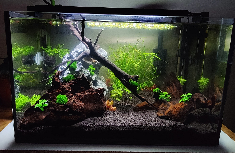 Oheiskommenttina tähän väliin, että olen katsonut ihan hillittömän määrän aquascaping-videoita ja alkuun olin niin tyytyväinen tähän tekeleeseeni, mutta eihän tällä oikeastaan ole mitään tekemistä aquascapingin kanssa, vaan tämä on ihan geneerinen planted tank. :D Jostain pitää kuitenkin aloittaa. Perustelen valintojani myös sillä, että tässä on nyt priorisoitu reittejä pohjalla sekä onkaloiden määrää. Haluaisi asukkeja ajatellen, että akvaariossa olisi joka puolella jotain eikä niin että on vain yksi hökötys keskellä ja ympärillä tyhjää. Lisäksi halusin, että myös akvaarion takaseinällä on piilopaikkoja ja uintitilaa. Noita aquascaping-videoita katsoessa en ole tykännyt siitä, että kaloilla ei ole niissä välttämättä mitään piilopaikkoja, jos laji on sellainen ettei se mene tiiviin kasvuston sisälle. Monissa aquascaping-akvaarioissa on täytetty 3/4 akvaariosta ja vain etuseinällä on taulumaisesti tyhjää tilaa liikkumiseen.