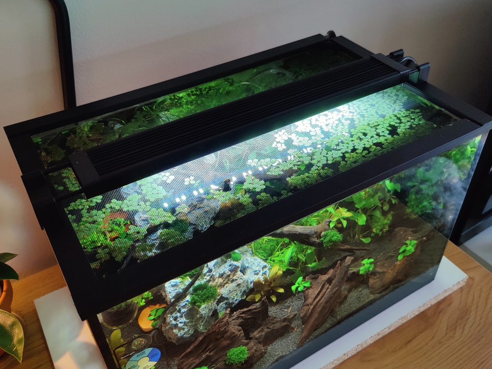 Olen kuitenkin saanut inspiraatiota noista videoista. Luulen, että tulen muokkaamaan akvaariotani vielä moneen otteeseen ja tekokivi saattaa jossain vaiheessa lähteä, mutta nyt pidän sitä tosi tärkeänä, koska siinä tosiaan on isoja luolia varsinkin pohjassa. Aion myös hankkia sellaista luonnollista monimuotoista koristesoraa, jotta saan tekstuuria pohjaan ja niitä mantelipuun lehtiä tulee myös ajan myötä. Olen yrittänyt vähän mietiskellä noita kasvejakin ja haluaisin lisää ainakin erilaisia sammalia ja muutenkin vähän eri kasveja, mitä tulin nyt ostaneeksi. Akvaarion ympärille aion asetella huonekasveja siten, että sivuseinät eivät ole ihan täysin paljaana huoneeseen. Ajattelin myös rakentaa jonkinlaisen telineen akvaarion päälle ja ripustaa siihen huonekasveja. Eli ikään kuin akvaariosta jatkuisi kasvit huoneeseen mutta pidän systeemit kuitenkin erillisinä. Mietin myös olisiko musta taustakuva sittenkin kivempi. Voisin hankkia palan mustaa kartonkia ja testata sillä miltä näyttää.