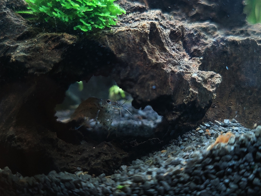 Akvaariossa on nyt 2 sinertävää Neocardina davidi sukarapua, jotka hankin joltain harrastajalta ja sitten 2 leväsukarapua eläinkaupasta. Tunnistan jokaisen yksilön erikseen. Luulen, että molemmissa lajeissa on nyt naaras-uros parit, mutta pikkusukisten kohdalla olen vähän epävarmempi. Sinisistä en ole saanut hyviä kuvia. Näissä kuvissa vissiinkin sama leväsukarapu kummassakin. Tältä ravulta puuttuu oikealta puolelta keskimmäinen iso liikkumajalka.