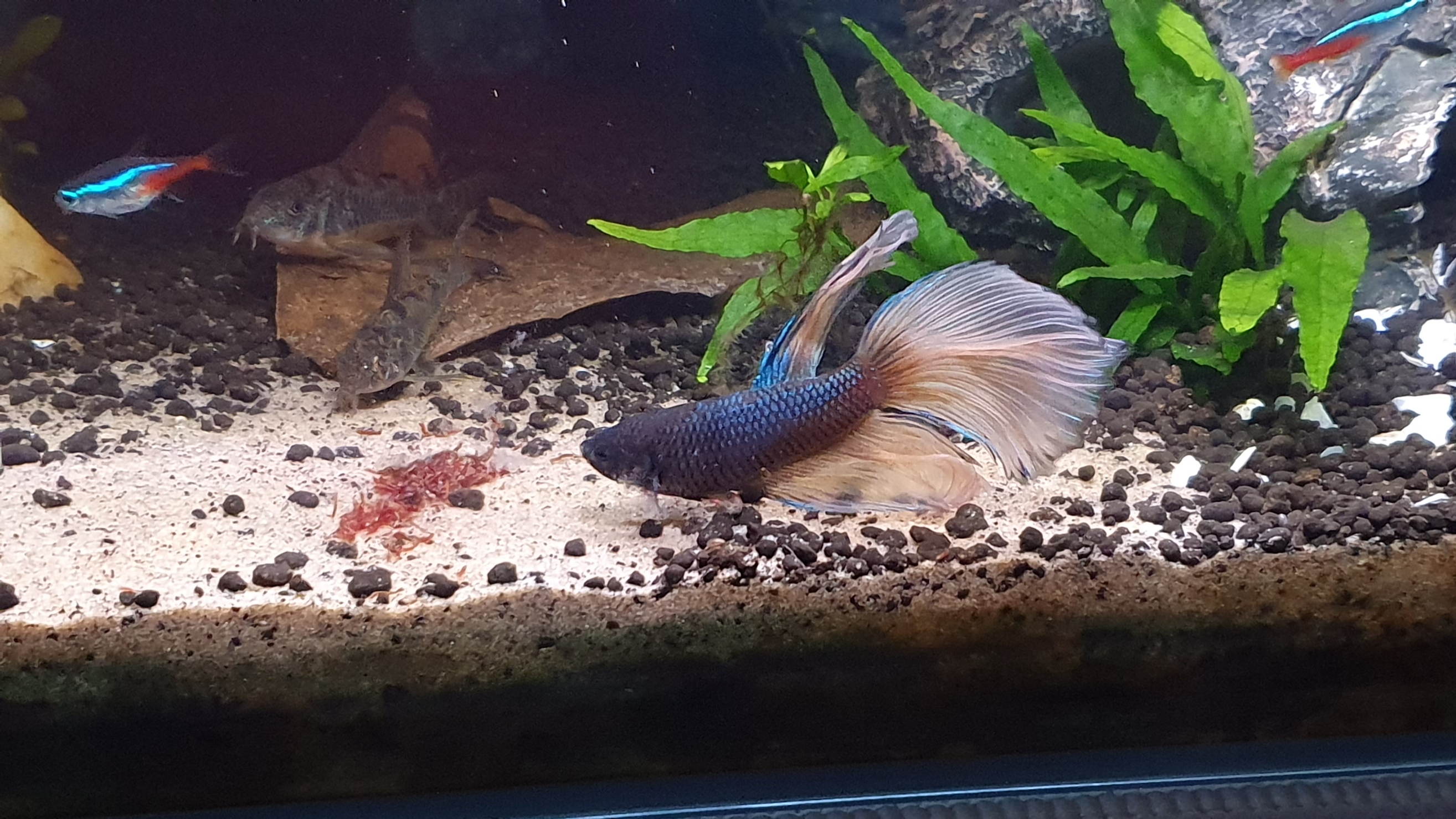 Akvaariot voi hyvin. Säikähdin vain yksi aamu taistelukalan käytöstä, kun se makoili pohjalla liikkumattomana. Kun minulla on ollut niin huonoa tuuria kalojen kanssa, pelkäsin pahinta ja oli aivan pakko herättää kala. Otin puisen sukkapuikon ja varovaisesti sipaisin sitä pyrstöstä, se ei onneksi säikähtänyt vaan liikahti ja heräsi syömään. Joskus se on säikähtänyt kovastikin jos yritän hätistellä sitä kun se on liikkumattomana. Sillä kun ei ole silmäluomia, että näkisi että se nukkuu. Taistelukala on nukkunut paljon ja eri aikoina, kuin sillä olisi epäsäännöllinen unirytmi. En keksi muuta syytä kuin monniset yöllä häiritsemässä kun ne on vilkkaimmillaan tai epäsäännölliset ruoka-ajat. Lisäksi Suomen kesän valoisuus häirinnee sitä, kämppä on ympäri vuorokauden valoisa, vaikka olisi kaihtimet kiinni. Jostain olen myös kuullut että taistelukala vaatisi korkeamman ph:n kuin hanavedelläni on sille tarjota. Se oli erityisen letarginen kun vielä oli juurakko pohjalla luovuttamassa veteen tanniineja ja ph laski 5.5:een. Taistelukala on tosi nirso, sille ei kelpaa vähänkään lionneet ruokarakeet, vaan ne pitää olla vasta lisättyjä ja kuivia. Artemioita se sentään syö vaikka olisi maha täynnäkin. Ehkäpä syötän sitä liikaa. Yritän muistaa ruokkia sen ainakin kahdesti päivässä.