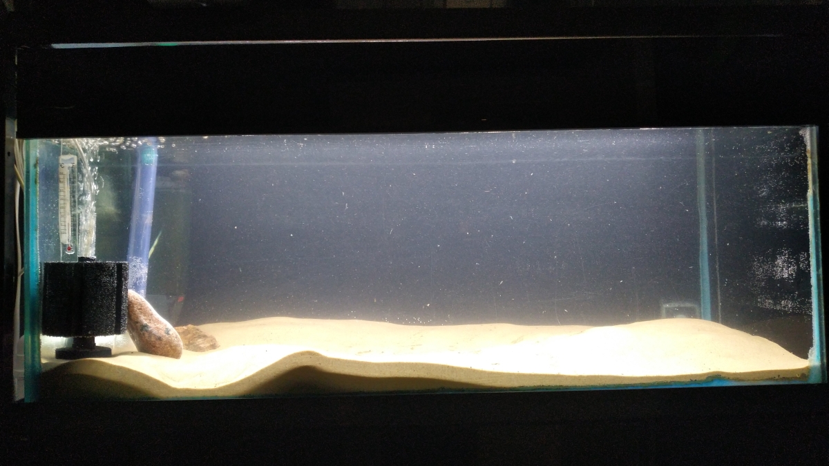 Ihan sattumalta lopulta huomasin, että jotain outoa kiiltelee akvaarion pohjalla ja kun tarkemmin katselin niin siellä oli lämmittimen lasiputken palaset. Niinkin olisi voinut käydä, että olisin laittanut käteni akvaarioon ja saanut helvetinmoiset jytkyt tai pahempaa, mutta onneksi niin ei käynyt.