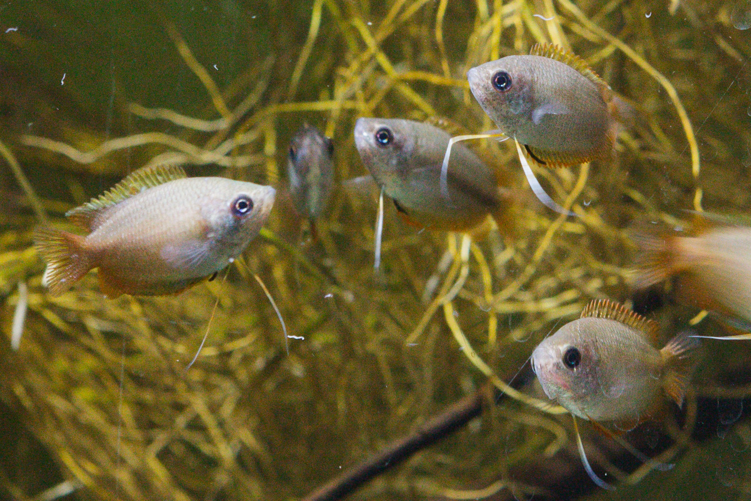 Kuten olen jo aiemmin kertonut, poikue oli varsin arka. Siksi hämmästyin totaalisesti, kun itse pitämäni naaras kadotti arkuutensa täysin välittömästi päästyään aikuisten sekaan! Tässä akvaariossa on kelluvaa vesisaniaista koko pinnan täydeltä. Vähäiset pintakasvit saattoivatkin olla yksi syy arkuuteen. Mahdollisesti myös "joukkopaniikki": kun yksi säntää karkuun, toiset perässä.