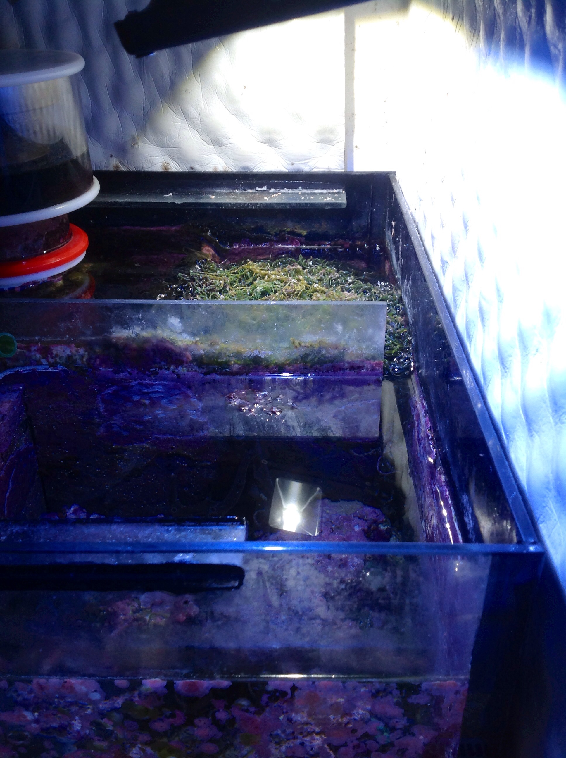 Totta. Mikäli tilaa olisi enempi tai sitä joskus tulevaisuudessa siunaantuisi lisää, tekisin vastaavan 4 tai 6 sukan versiona. Tässäkin 2 rinnan ja 2-3 peräkkäin. Myös alusta asti rakennettaessa olisi näillä sukilla joku teoreettisesti fiksumpi paikka ala-altaassa. Nykyisellään kun alas saapuva vesi kulkee rataa kupla-ansa - skimmeri - chaeto (pohjalla 5cm hiekka ja kiveä) - sukat - nosto- ja syöttöpumppu. Ja kuriositeettina vielä että nostolinjasta on otettu sivuhaara sivurefuun (n.100l täynnä kiveä) josta paluu nosto-osioon, ja reaktoreiden läpi (fosfaatinpoistaja + pelletit) kulkenut vesi syötetään skimmerin imun tuntumaan.