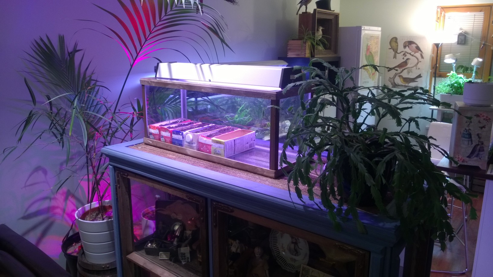 Näin tällä kertaa.. tuli tarve aloittaa siementen idätys kesää ajatellen. Saa sitten jotain tuoretta vihreää tuolta pihalta haettua. Piti hakea jostain marketista semmoinen muovinen idätyshärpäke, mutta akvaarioharrastus tarjosikin paremmat välineet. Allas on 75x25 ja 30 korkea, noin 56 litrainen. Kirpparilla tuli vastaan ja kaksikymppiä tarvitsi maksaa pelkästä altaasta, valaisimesta ja kansilasista. Pyyntihinta oli 50e sis. aquaball, lämmitin ja jotain kiviä, mutta jätin ne suosiolla myyjälle kun itsellä ei ole käyttöä. Tinkaaminen kannattaa! Loisteputkessakin oli valmiiksi Osram Flora kasvilamppu, lienee harrastajalla ollut leväongelma. Kansilasi pitää kosteuden kivasti sisällä.