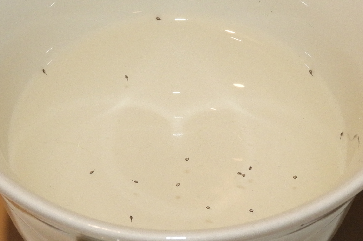 Tarjosin tänään ensimmäistä kertaa mikromatoja, mutta niitä ei syöty. Kiinnostuneena muutama poikanen kyllä tutkiskeli niitä mutta eivät pitäneet matoja ruokana. Kun niitä ei ollut syöty yhtään parissa tunnissa, yritin imeä kaikki madot pois pohjalta pipetillä, etteivät kuollessaan pilaa vettä. Seuraavaksi tarjoan mikromatoja vasta, kun poikaset ovat isommassa tilassa, mihin ei mene enää montaa päivää.
