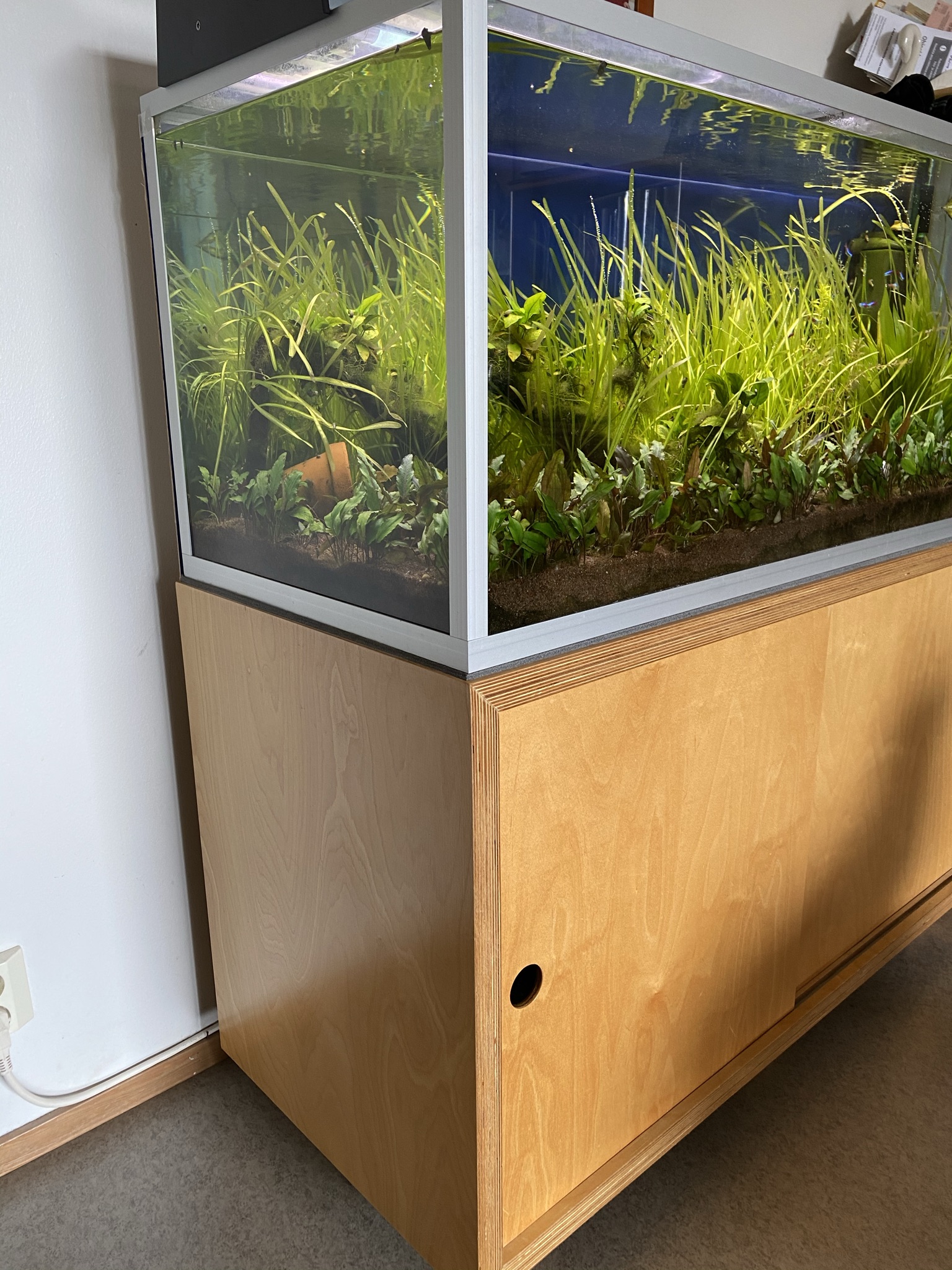 Kappi on 2002 30 mm vanerista rakennettu 107cm x 47cm x 65cm, päällä nyt akvaario 105cm x 45cm x 45cm (210 l)