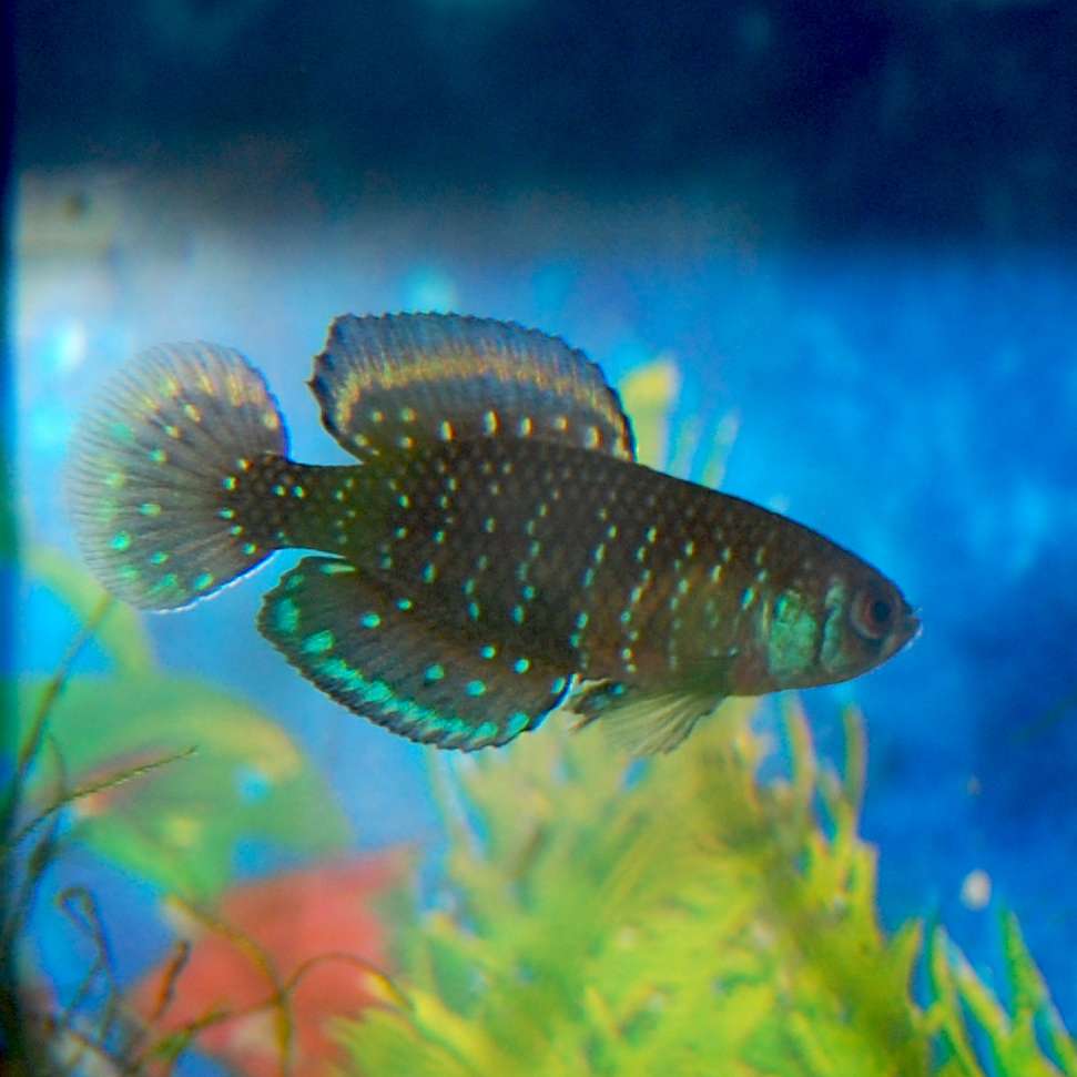 Kuvassa täysikasvuinen koiras, pituudeltaan n. 5cm. Evien kauniinsiniset korostukset eivät kuvassa pääse oikeuksiinsa.