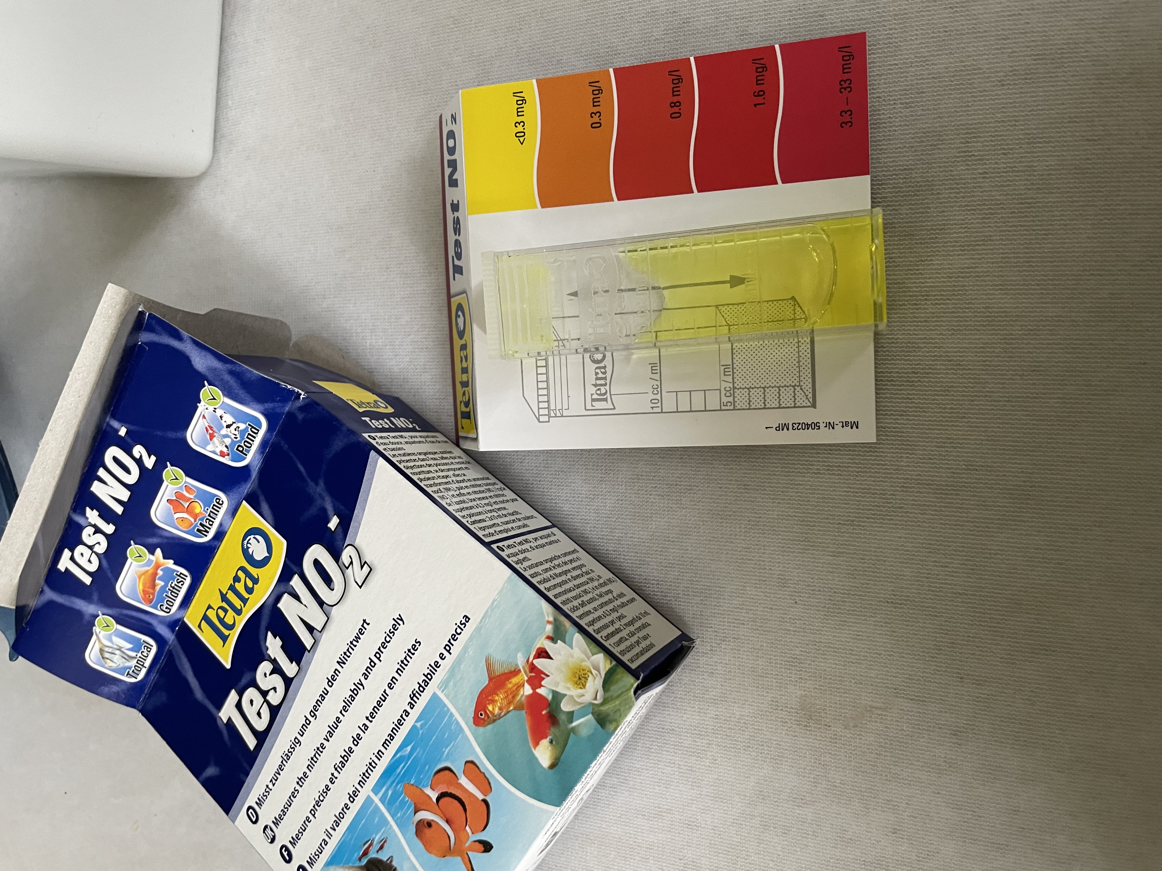 Liuskatestillä voit heittää jotain lintua. Jos mahdollista, osta JBL:n NO2-tippatesti. Voi olla niinkin, että vedessä on nitriittiä tai nitraattia, mutta liuskatesti ei havaitse sitä.
