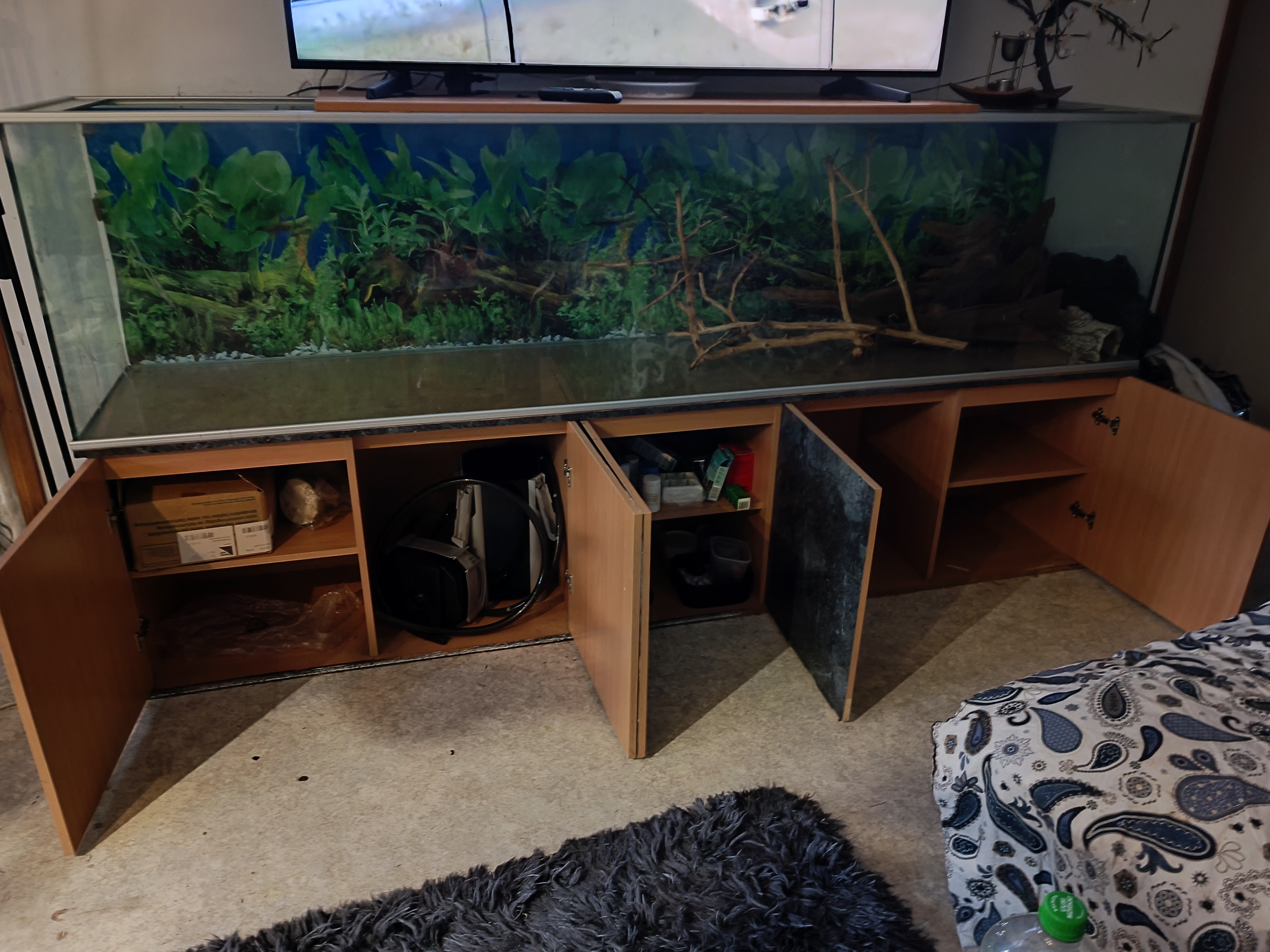 Eli 600litraa.Mukaan kaapisto ja ulkosuodatin.Akvaariosta on poistettu vanhat silikonit ja vaatii sen laiton.Ei ollut vuotava, vaan halusin vaihtaa uudet, mutta selän kunto ei antanut periksi.Vain haku ja ainakin neljä kantajaa.