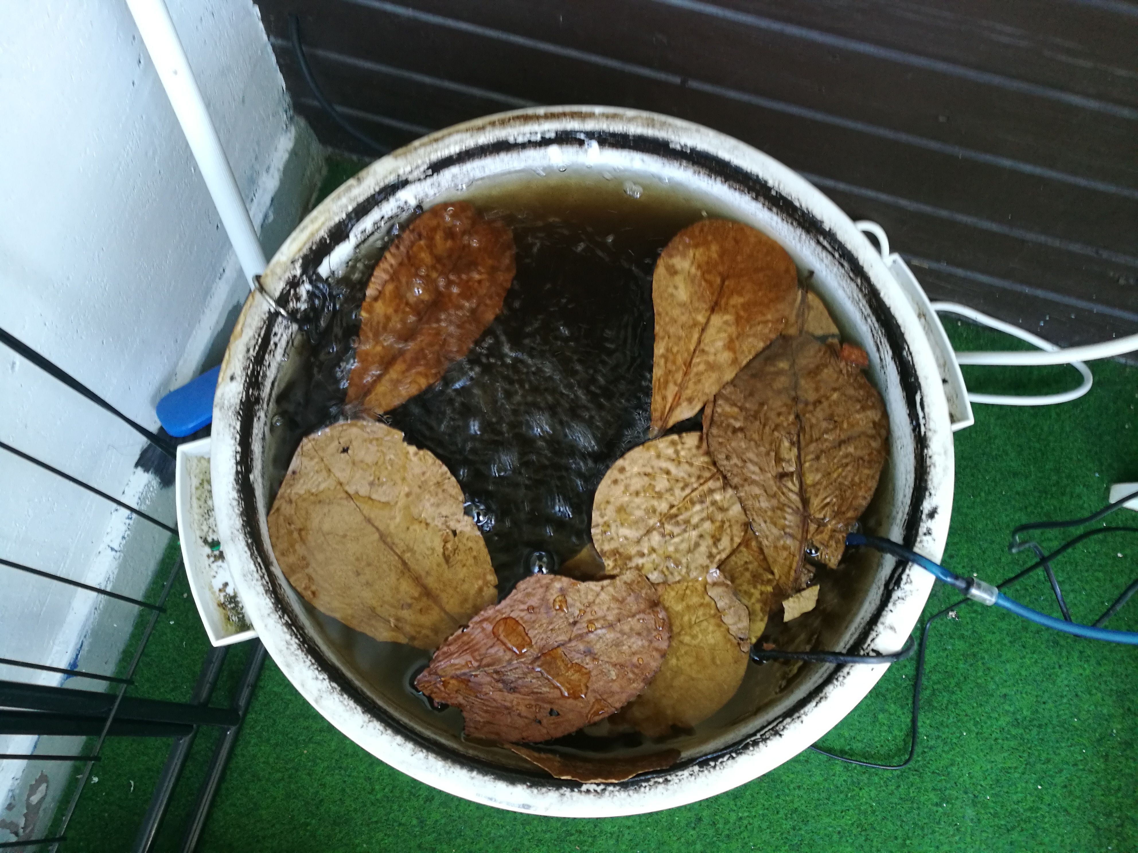 Turve ei paljoa värjää vettä. Vesi on lievästi keltaista - en tiedä, turpeen vai lehtienkö takia. Turvesukka roikkuu altaan yläosassa. Tänään turve oli viimein vettynyt niin paljon, että sukka roikkuu alaspäin eikä kellu. Ylihuomenna tulee seuraavan kerran vesiarvoja, niin näkee vaikuttaako turve. Tuskin vielä, koska KH on kuitenkin vielä 4,5 (viime mittauksessa).