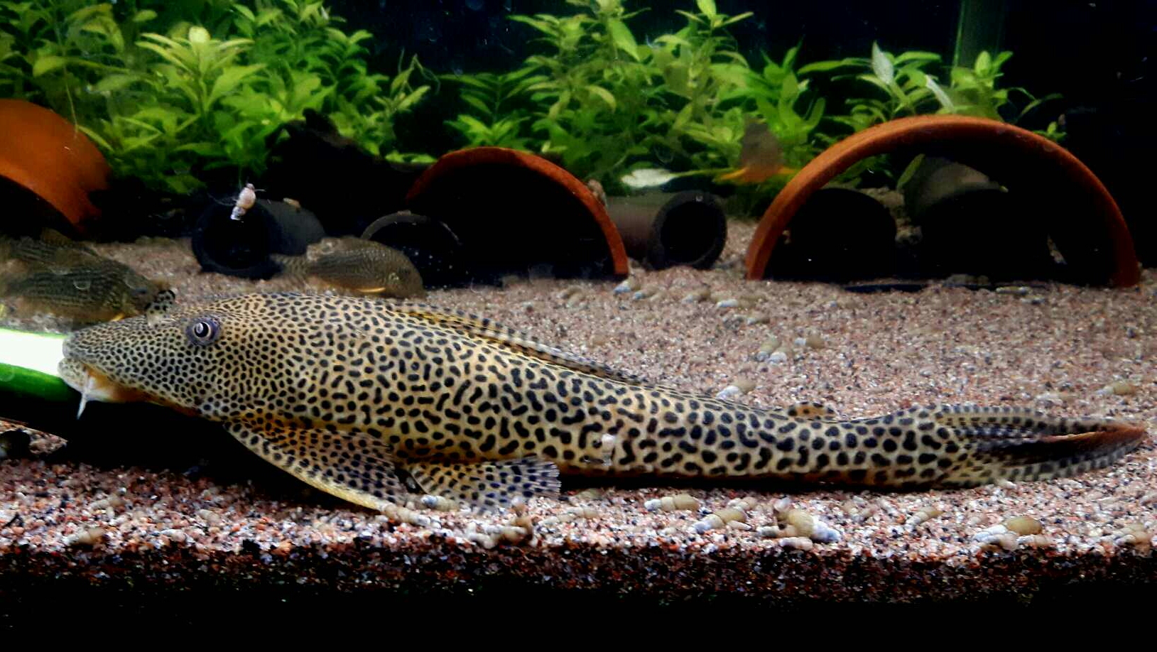 Tämmöinen muutti meille viime viikolla. Kumpis tämä nyt sitten on L-200 topaasi vai L-128 safiiri. L-200 high fin tuo ei ainakaan mielestäni ole, koska selkäevän takana ei ole Baryancistruksille kuuluvaa kalvoa. Kalalla on kokoa päästä pyrstön päähän se 5 cm eli pieni on vasta. Jos olisi safiiri ni...