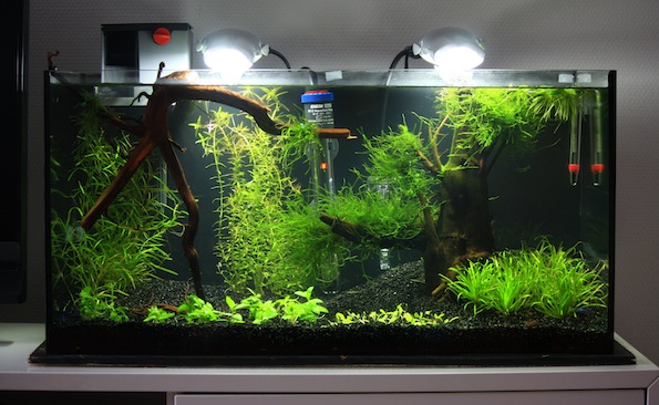 Vanha akvaario, joka oli kyseisessä kuvassa vielä alkutaipaleilla. En tajunnut ottaa myöhemmässä vaiheessa kuvia, kun kasvit oli kasvanut.