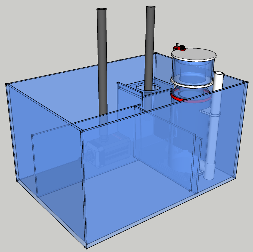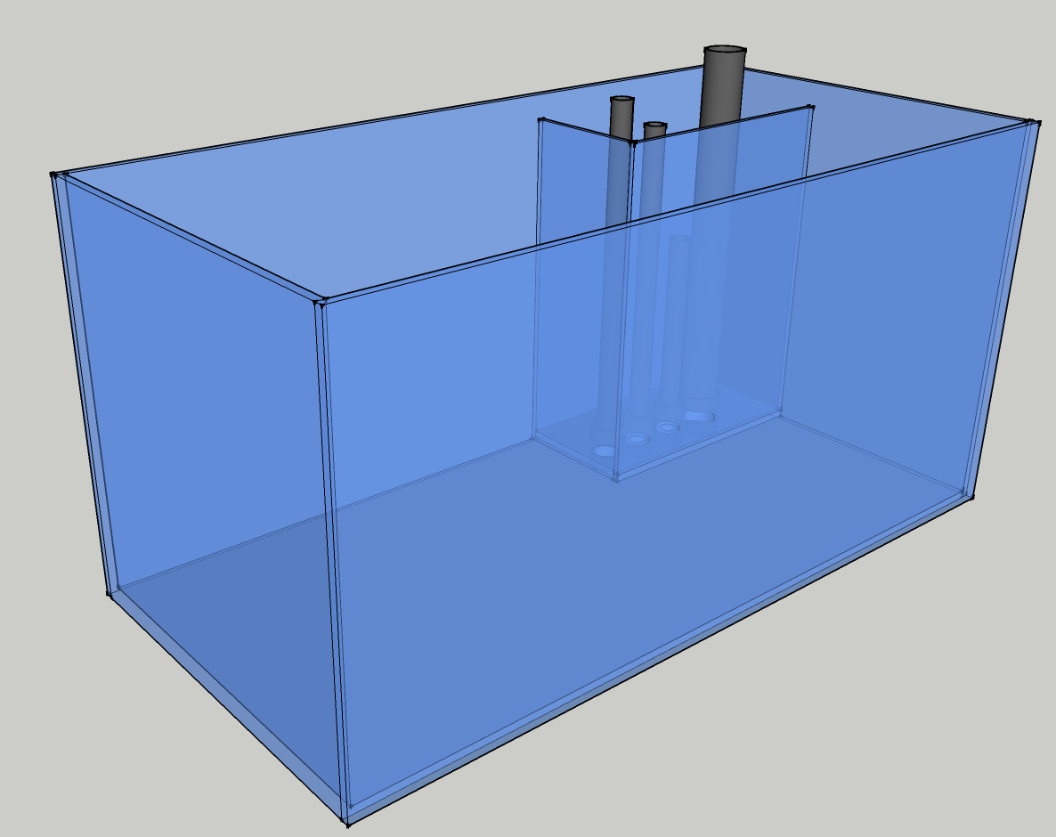 Mitat 70x50x40cm, lokeroitu 4(3) osaan: tulo (15x20cm)/vaahdotinkammio (20x35cm), refugium (35x50cm) ja poistokammio (50x20cm).