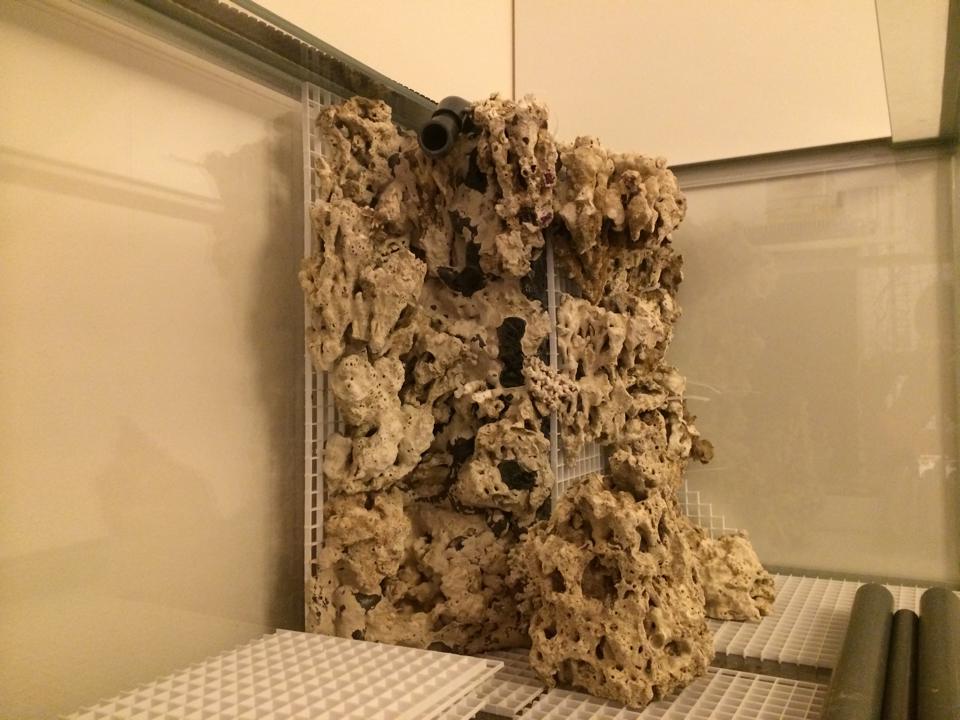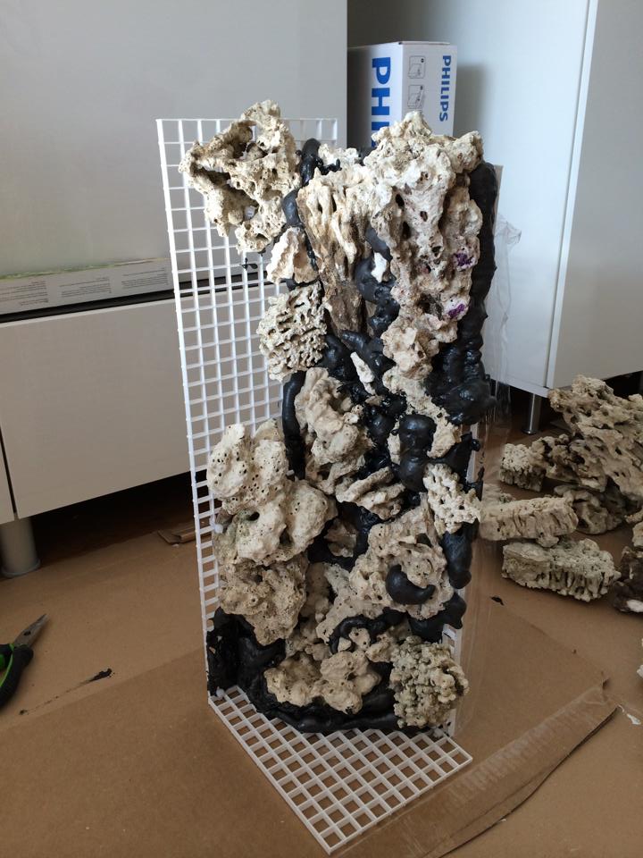 Vihdoin on saanut jotain tehtyä tämän projektin eteen. Putkitus melkein kasassa ja lopullista liimausta vaille valmis, kaatokulmaa peittävä kiviseinä alkaa muodostua suhteellisen hyvin - reef-foamit vielä vetämättä väleihin ja peittävä aqua-zement kerros vetämättä sen päälle. Lisäksi pitää vielä kelmuttaa taka- ja sivulasit ja lisätä kiviseinää jonkun matkaa takalasille.