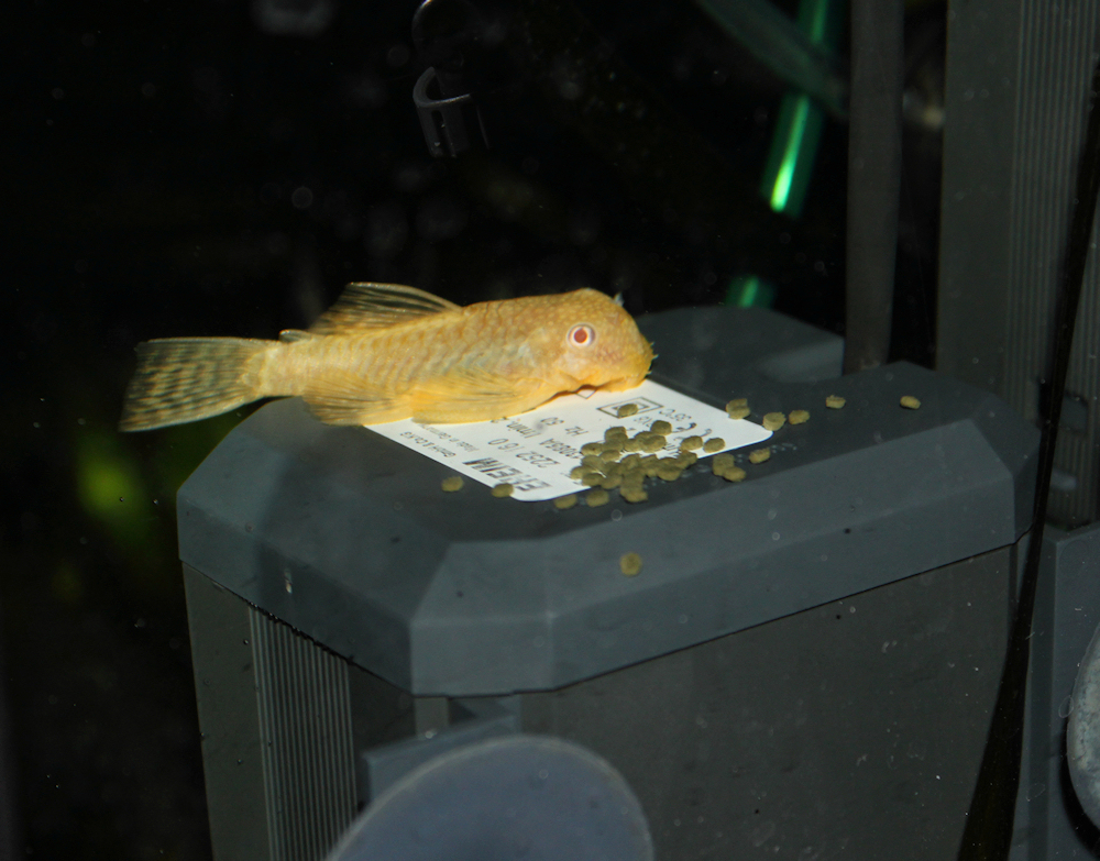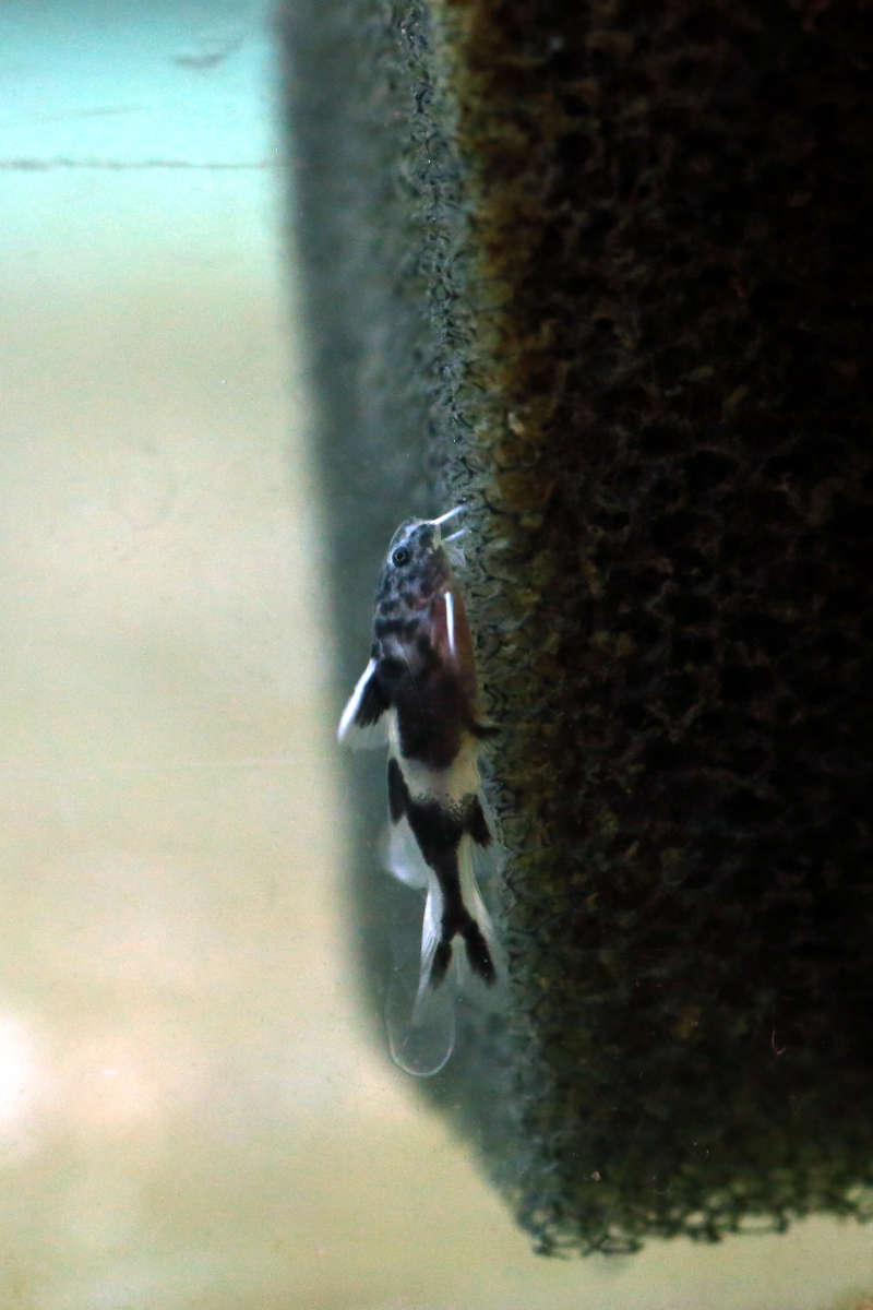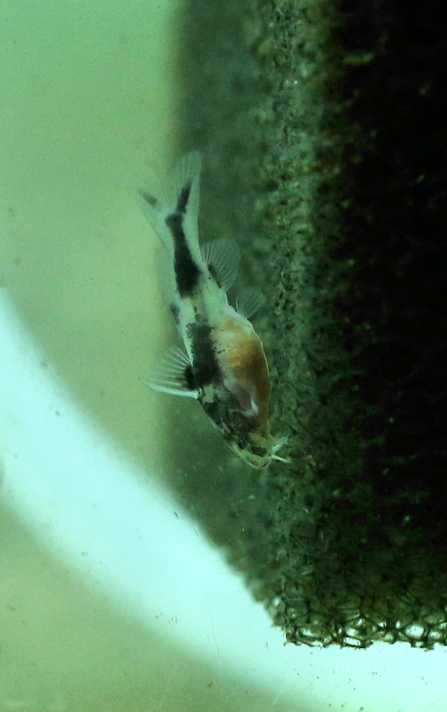 Synodontis lucipinnis, poikanen. Vieressä suuri ja mahtava imukuppi:).