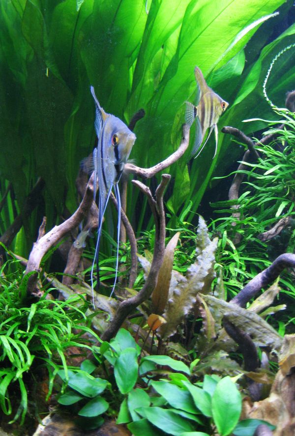 Oh my. Lehtikalojen maailmassa kyllä aina riittää juonenkäänteitä. Voiko puutteeseen kuolla? :D Mun tuo yksi "tavis" eli viljelty lehtikalanaaras on päättänyt näemmä että nyt kudettaa. Se puhdistaa tuolla lehteä minkä kerkiää asetinputki töröttäen. Välillä se jahtaa kaikki muut lehtikset toiseen päähän mutta käy houkuttelemassa yhtä selkeää koirasta luokseen. Mähän en ole siis tiennyt ollenkaan ettei lehtikala tarvitse partneria kutuvireen saamiseksi. Taitais sille kelvata näemmä tuo vähän tavallisemman näköinenkin Surinamin lehtis, sekin saa kyhnäystä kylkeen. Pojat vaan ei taida tajuta ollenkaan että nyt olis makuukammari valmiina :D