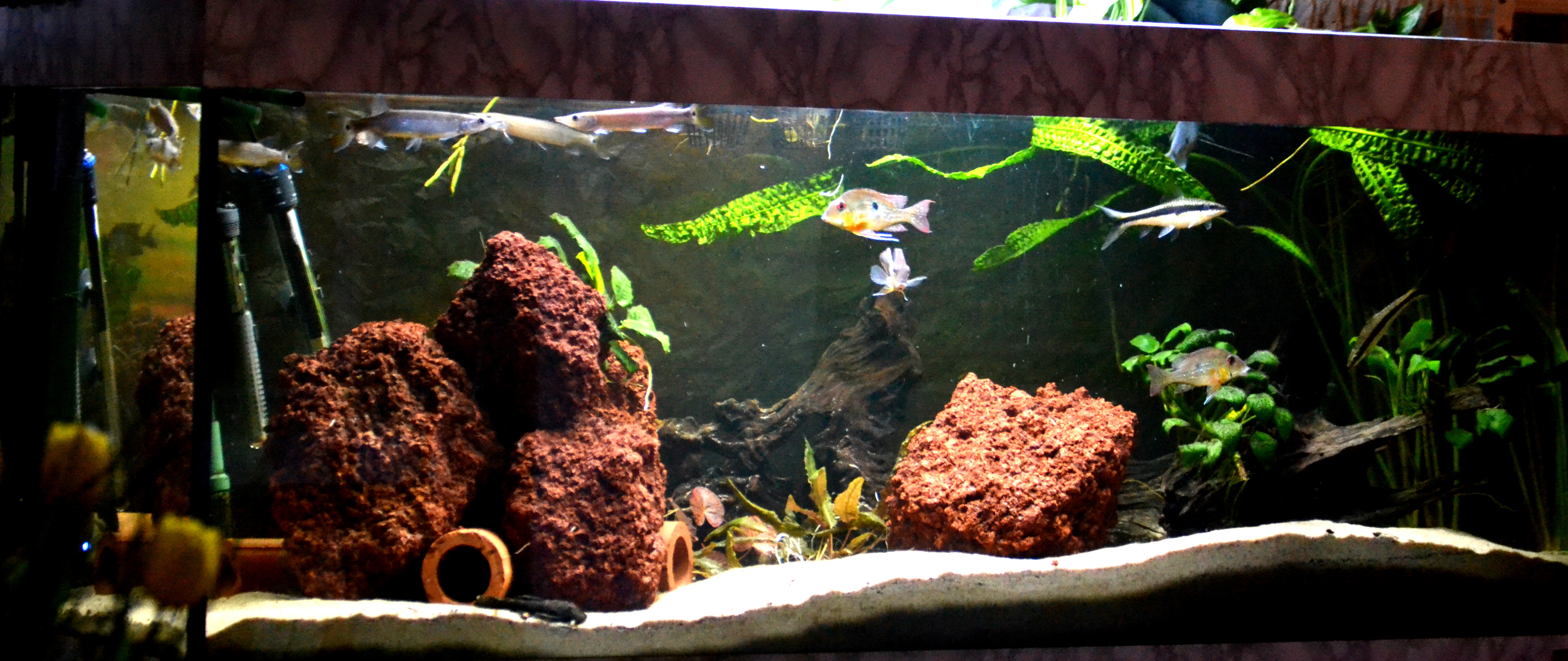 Harrastuksen löysin melkolailla tasan kuusi vuotta sitten vuonna 2009 ja aloitin 136-litraisella Joki-akvaariolla. Vuoden kuluttua altaassa oli yli 100 miljoonakalaa ja kuume isompaa allasta kohti nousi. Miljoonakalat lähtivät Tampereelle liikkeeseen ja myin akvaarion. Myynnin aikana kuitenkin kävin hakemassa tilalle Juwelin 450 litraisen Rion. Junnun budjetilla ostettiin kaksi vuotta vanha käytetty allas ja vanha kissan pissan hajuinen turvonnut jalusta korvattiin omatekoisella. Tekniikaksi uutta Eheimiä, oli se sitten auto tai muuta tekniikkaa, niin perusteiltaan sen oli oltava Saksalaista.