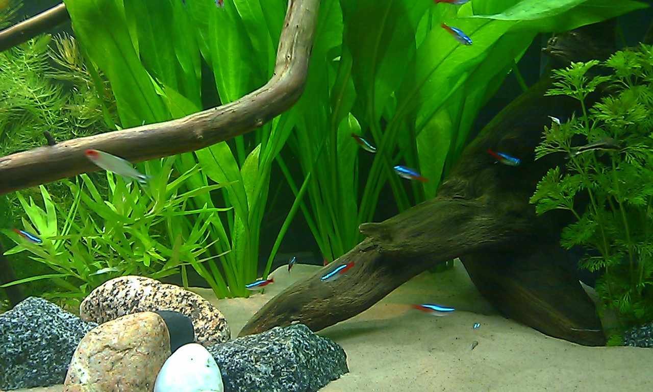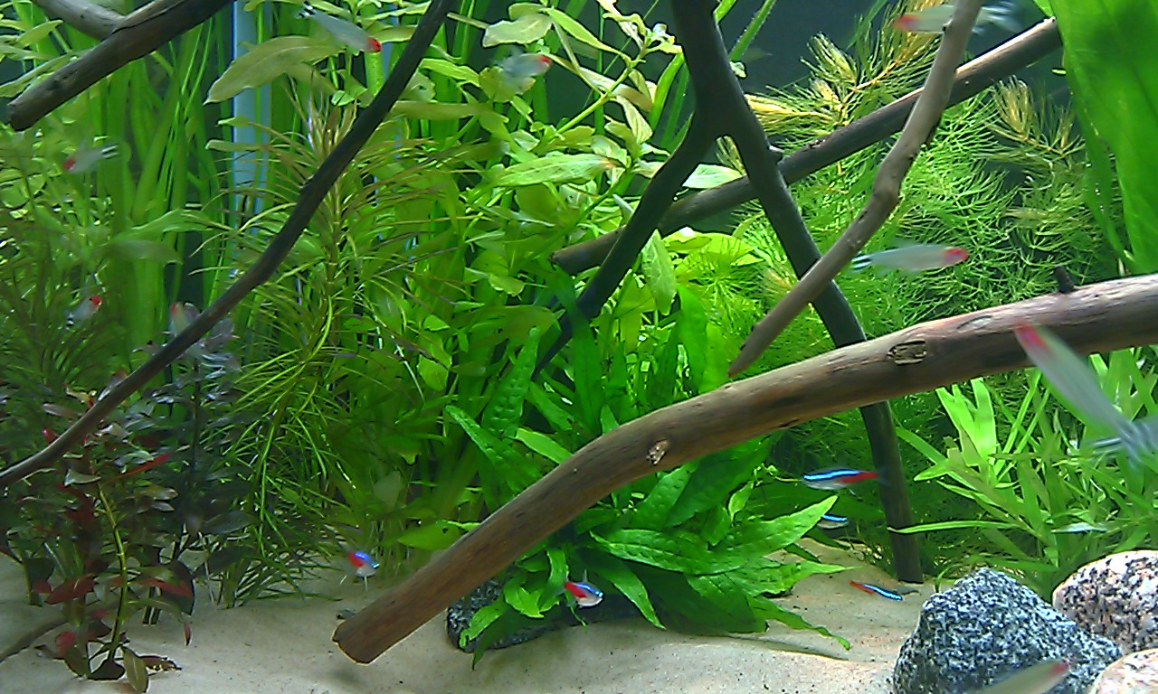 Toinen mikä kasvaa liian isoksi ja nopeasti tuolla riossa on jättiläisvallisneria, pinta on täys sitä, sekin vähentää valoa entisestään. Sitä voisi karsia niin että jättäisi aina muutaman taimen kumpaakin päätyyn.